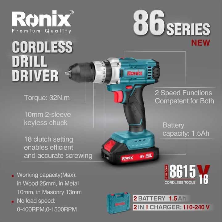 طراحی ارگونومیک و مقاوم بدنه، گیربکس دو حالته، امکان تغییر گشتاور با تنظیمات کلاچ در 18 حالت مختلف، ارائهی ابزار با کیف BMC مقاوم به ضربه به همراه متعلقات کاربردی، از مهمترین ویژگیها و مزایای دریل پیچگوشتی چکشی شارژی ترکمتردار دو سرعته 16 ولت رونیکس، با مدل 8615 هستند.