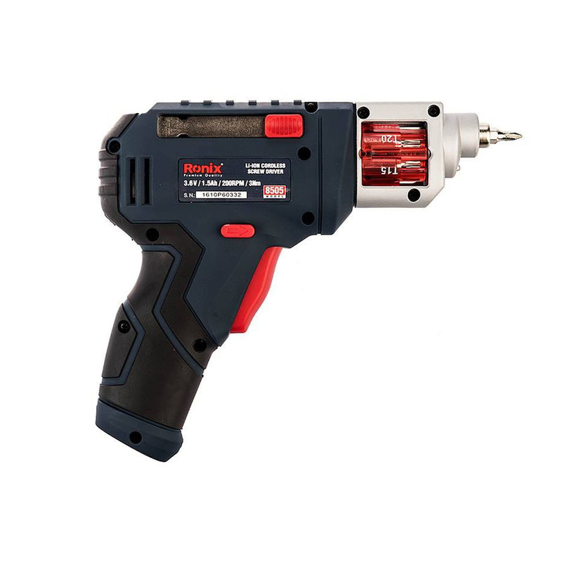 امروزه پیشرفت علم و تکنولوژی در اکثر ابزارها و دستگاه‌ها قابل لمس است. ابزار مکانیزه شارژی، برقی و بادی جای ابزار سنتی که متکی به نیروی انسان بودند را گرفته‌اند و با دقت و سرعت بیشتر، کارایی و عملکرد بهتری را از خود نشان می‌دهند. یکی از این ابزار، پیچ گوشتی شارژی «Ronix» «رونیکس» است که با مدل (8505) به بازار ارائه شده است. این محصول 560 گرمی دارای سرعت گردش آزاد 200 دور بر دقیقه است و باتری لیتیومی آن دارای ولتاژ 3.6 ولت است. این پیچ‌گوشتی شارژی دارای 18 سری مختلف با سایزهای متفاوت بوده و همچنین یک رابط سری پیچ گوشتی 6 سانتی‌متری دارد. قابلیت چپ گرد و راست گرد این محصول به شما اجازه باز و بسته کردن پیچ‌ها را می‌دهد. پیچ گوشتی شارژی رونیکس دارای گشتاور 3 نیوتن متر بوده و در کیف نگهدارنده دستگاه، شارژر مخصوص آن نیز موجود است. یک عدد چراغ LED در قسمت جلوی این ابزار تعبیه شده که با کار کردن دستگاه، روشن می‌شود.
