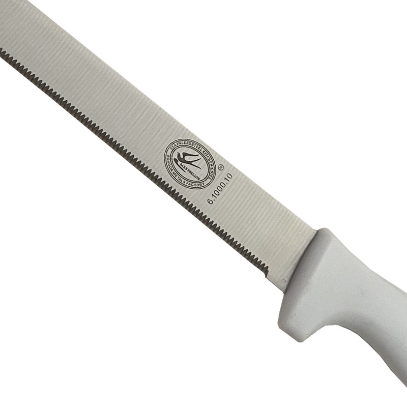 چاقو اره ای مناسب برش انواع کیک، نان و... برند BARNSWALLOW ساخت چین بوده و از کیفیت بسیار خوبی برخوردار می باشد. طول این چاقو اره ای 39 سانتی متر بوده که 14 سانت از آن شامل دسته چاقو و 25 سانت آن چاقو اره ای می باشد. جنس این چاقو استنلس استیل است.