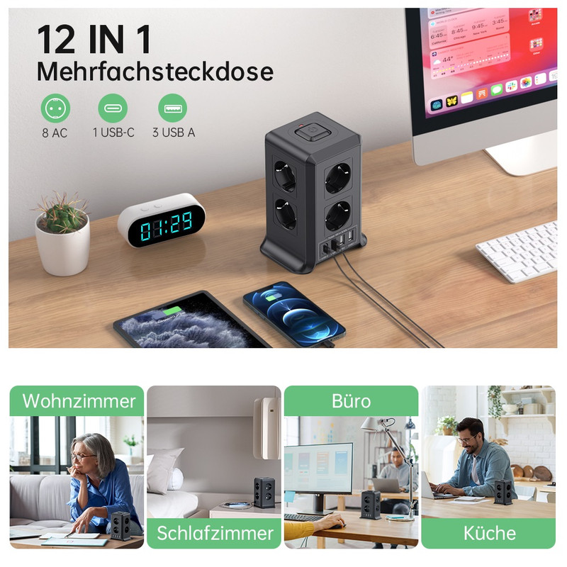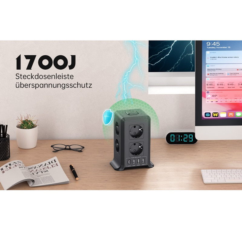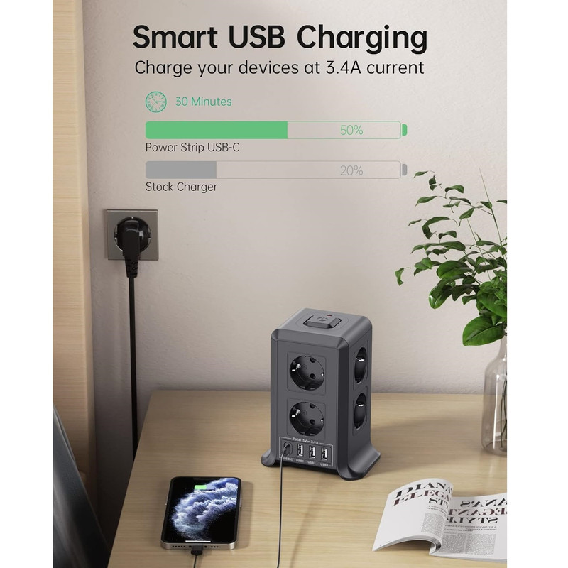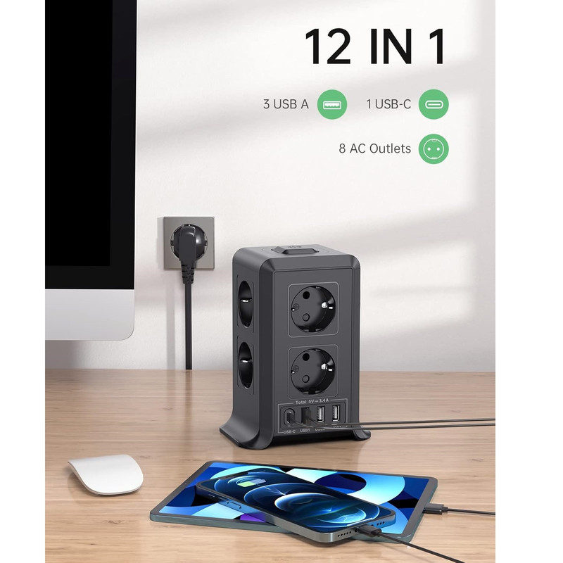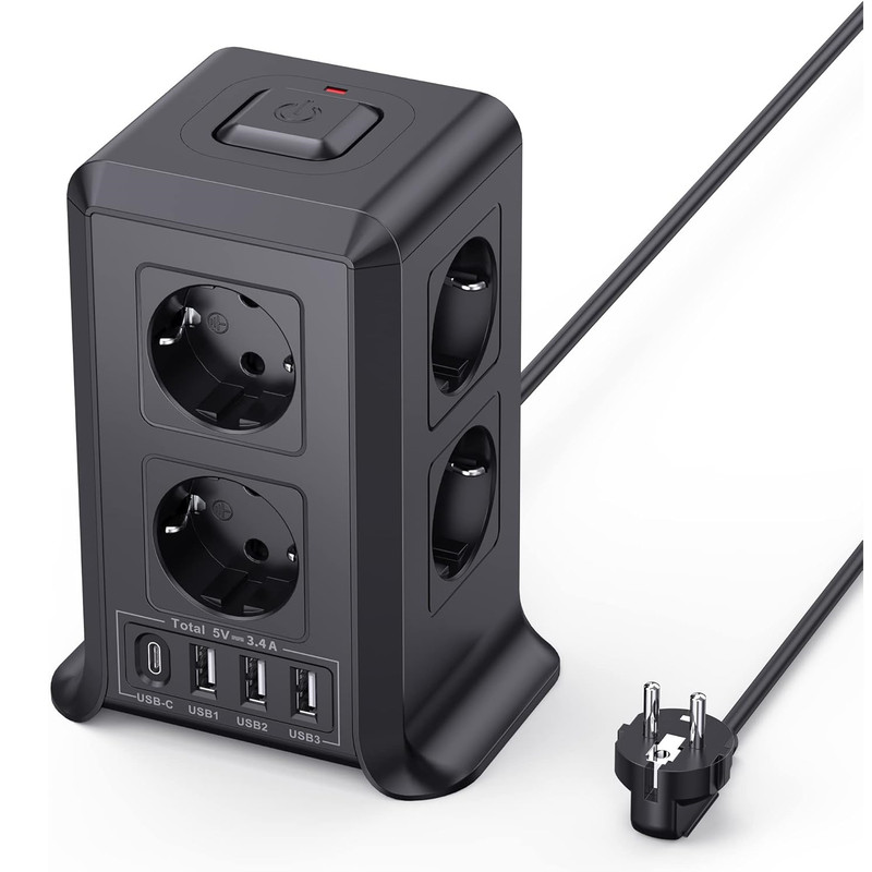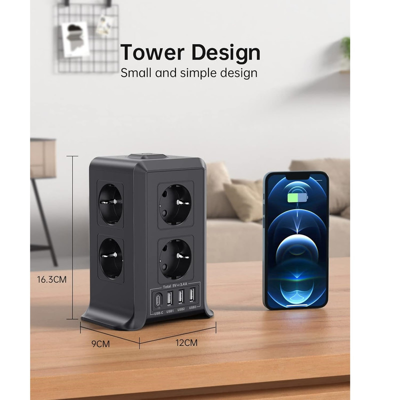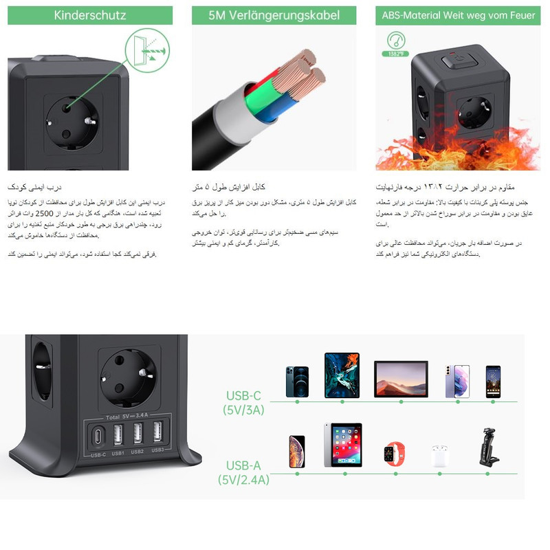 سایر توضیحاتکابل افزایش طول ۵ متری، چندراهی برق، محافظ ولتاژ، پریز برق ۸ پورته با ۴ پورت USB، پریز برق چند شاخه با ۴ کلید، پریز برق ایستاده برای منزل چندراهی برق ۱۲ در ۱: این چندراهی برق مجهز به ۳ پورت USB-A (5 ولت/۲.۴ آمپر) و ۱ پورت USB-C (5 ولت/۳.۱ آمپر) برای شارژ سریع چندین دستگاه، و ۸ پریز برق AC است که از حداکثر توان خروجی ۲۵۰۰ وات/۱۰ آمپر پشتیبانی می‌کند. ایمن و قابل اعتماد: این کابل رابط محافظت‌شده در برابر نوسانات برق، دارای محافظت در برابر نوسانات برق تا ۱۷۰۰ ژول و محافظت در برابر اضافه بار است که هنگام استفاده از این دکل برق برای لوازم خانگی با توان بالا یا دستگاه‌های برقی و غیره، ایمنی را تضمین می‌کند. چندراهی برق با کلید: چندراهی برق دارای یک کلید است، برای خاموش کردن منبع تغذیه فقط کافی است کلید را فشار دهید. این کار باعث صرفه‌جویی در مصرف برق می‌شود و نیازی به وصل کردن یا جدا کردن دوشاخه نیست. 【توجه】 این کلید پورت ورودی USB را کنترل نمی‌کند. محافظت در برابر نوسانات برق در چندین پریز: پریز برق چندکاره با USB دارای گواهینامه CE و RoHS است و از مواد پیشرفته ضد حریق استفاده می‌کند. هنگامی که منبع تغذیه بیش از حد بارگذاری/بیش از حد گرم/اتصال کوتاه می‌شود، سوئیچ اضافه بار قابل اعتماد به طور خودکار فعال می‌شود تا از دستگاه‌های شما محافظت کند. کابل افزایش طول ۵ متری: با محافظ نوسان برق چندراهی با کابل افزایش طول ۵ متری، می‌توانید به راحتی از سر دیگر مبل عبور کنید. این چندراهی‌های برق دارای طراحی برجی شکل هستند که برای اتاق نشیمن، اتاق خواب، میز کامپیوتر، فضای اداری و غیره مناسب هستند. پریز چندگانه سامریور چندراهی‌های برق Sameriver با ۸ پریز و ۳ پورت USB A+1 پورت USB C. ایده‌آل برای استفاده در خانه، محل کار یا مدرسه، که ایمنی دستگاه‌های شما را تضمین می‌کند. این چندراهی برق یک کلید دارد، فقط کافی است کلید را فشار دهید تا منبع تغذیه خاموش شود. این کار باعث صرفه‌جویی در مصرف برق می‌شود و نیازی به وصل کردن یا جدا کردن دوشاخه نیست. توجه: این کلید پورت ورودی USB را کنترل نمی‌کند! چندپریز با محافظت در برابر نوسانات برق: محافظ چندراهی برق ۱۷۰۰J می‌تواند دستگاه‌های الکترونیکی شما را از نوسانات ناگهانی و افزایش ناگهانی ولتاژ محافظت کند. لطفاً قبل از استفاده، توان و جریان نامی دستگاه‌ها را بررسی کنید. مطمئن شوید که توان تمام دستگاه‌های مورد استفاده در پریز نمی‌تواند بیش از ۲۵۰۰ وات باشد.