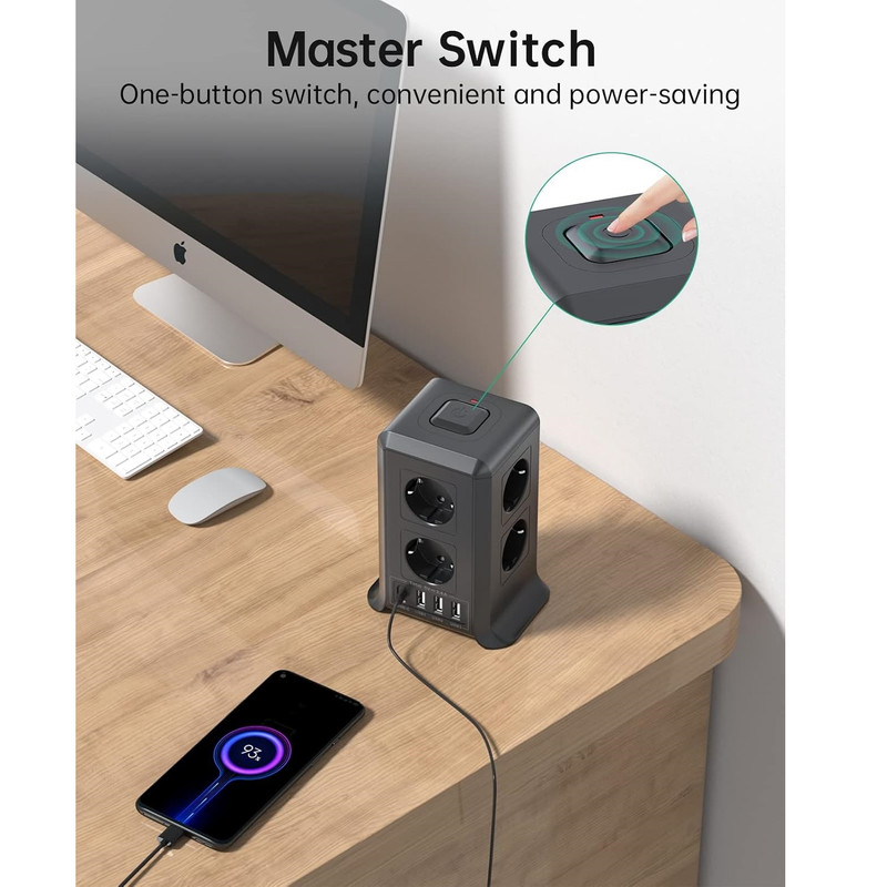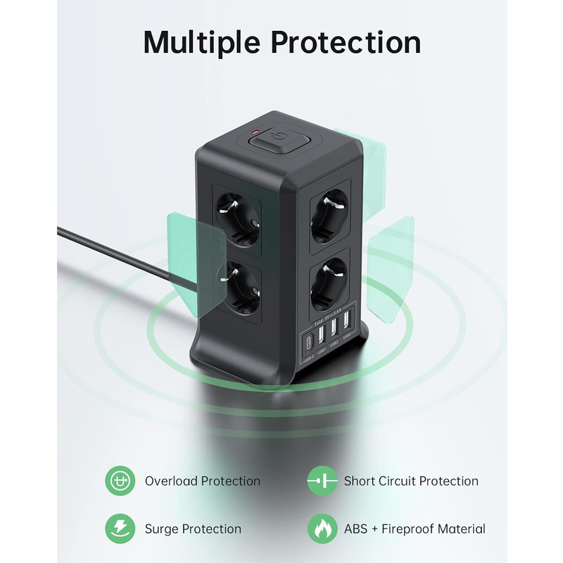 توضیحات پریز 8 عدد پریز مقاوم در برابر حرارت ۱۳۸۲ درجه فارنهایت جنس پوسته پلی کربنات با کیفیت بالا: مقاومت در برابر شعله، عایق بودن و مقاومت در برابر سوراخ شدن بالاتر از حد معمول است. در صورت اضافه بار جریان، می‌تواند محافظت عالی برای دستگاه‌های الکترونیکی شما نیز فراهم کند. ایمنی کودک: ایمنی این کابل افزایش طول برای محافظت از کودکان نوپا تعبیه شده است، هنگامی که کل بار مدار از 2500 وات فراتر رود، چندراهی برق برجی به طور خودکار منبع تغذیه را برای محافظت از دستگاه‌ها خاموش می‌کند. طول کابل ۵ متر : کابل با طول ۵ متری، مشکل دور بودن میز کار از پریز برق را حل می‌کند. سیم‌های مسی ضخیم‌تر برای رسانایی قوی‌تر، توان خروجی کارآمدتر، گرمای کم و ایمنی بیشتر.