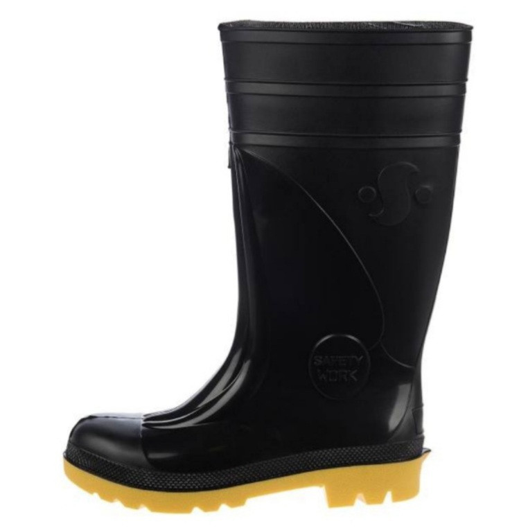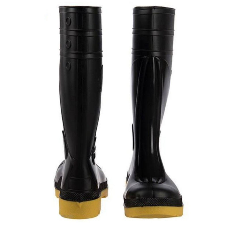 چکمه بلند مشکی با جنس پی وی سی جهت حفاظت از پا در محیط های آبی می باشد که خطری پنجه پا را تهدید نمی کند زیرا این چکمه پنجه فولادی ندارد.