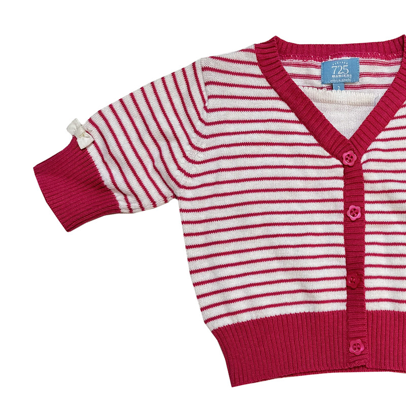 پلیور نوزادی برند 725 بابیس (725 BABiES) دارای 4 دکمه در جلو می باشد. همچنین این پلیور دارای سر آستین کشی همراه با پاپیون تزئینی می باشد. برند مبدا کالا مکزیک و تولید شده در بنگلادش است. جنس این پلیور فوق العاده با کیفیت از 100 درصد پنبه تشکیل شده است.