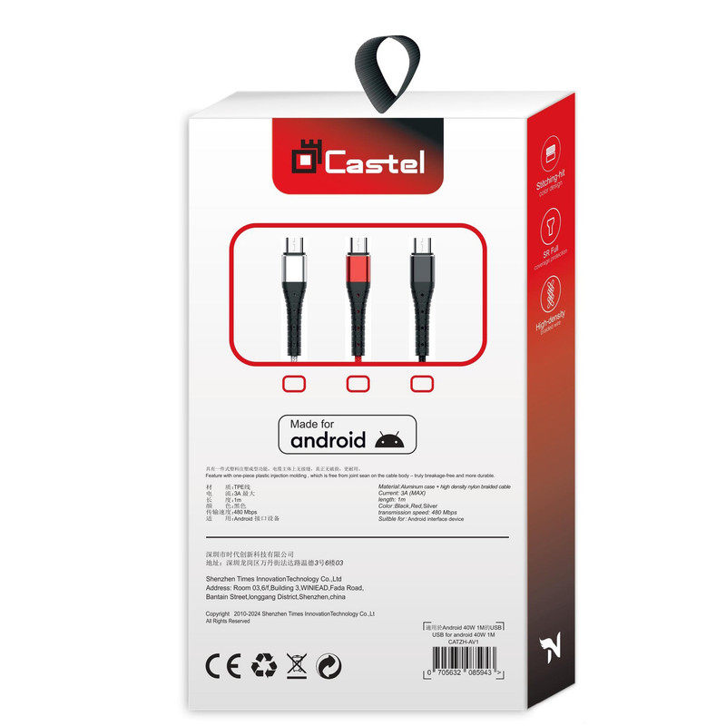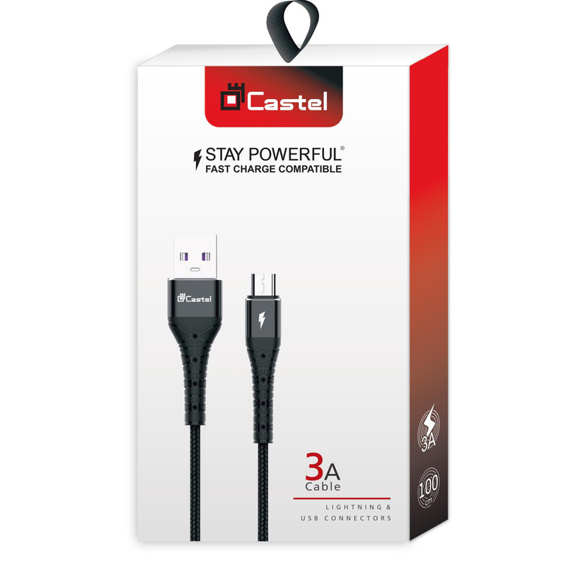کابل کنفی با برند کستل Castel می تواند جایگزین بسیار مناسبی برای کابل های معمولی گوشی های اندروید باشد زیرا با توجه به جنس کنفی و نخی خود، در برابر فشار و کشش بسیار مقاوم بوده و قطعی و پارگی این کابل ها تقریبا صفر درصد هست. بنابراین بسیار مناسب هست که برای گوشی ها و تبلت هایی که خصوصا فرزندانمان از آنها استفاده می کنند تهیه کنیم زیرا بچه ها با توجه به اینکه کابل ها را زیاد در حالت فشار و کشش قرار می دهند ممکن است خرابی کابل شارژر آنها زیاد باشد اما با تهیه این کابل های کنفی دیگر از این بابت نگرانی نخواهید داشت. این کابل ها برای انواع دستگاههایی که دارای کانکتورهای USB هستند، مناسب است. این کابل بدنهای با روکش کنفی دارد و در برابر پیچیدن و گره خوردن مقاوم است. این محصول یک متر طول دارد و در یک سمت آن کانکتور USB و در سمت دیگر یک کانکتور Micro USB قرار دارد. این کابل قابلیت انتقال اطلاعات و شارژ سریع را برای شما فراهم میکند.