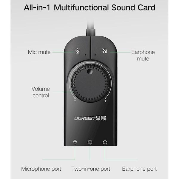 شرکت «یوگرین» محصولی را با نام «CM129-50599» روانه بازار کرده که در واقع یک کارت صدای اکسترنال برای استفاده روی کامپیوتر است . این محصول از طریق رابط USB به کامپیوتر متصل می‌شود و می‌تواند 2 درگاه 3.5 میلی‌متری صدا به درگاه‌های کامپیوتر اضافه کند . به کمک این درگاه‌ها می‌توان هدفون ، اسپیکر ، میکروفن و هر تجهیزاتی که از طریق جک 3.5 میلی‌متری به کامپیوتر متصل می‌شود را به کامپیوتر خود متصل کرد . برای استفاده از این محصول نیازی به انجام تنظیمات خاصی نیست و تنها با اتصال آن به کامپیوتر همه‌ چیز برای شروع آماده خواهد بود . از قابلیت‌های جذاب در این محصول می‌توان به پشتیبانی آن از کنسول‌های پلی استیشن Pro و Slim اشاره کرد . به این صورت که می‌توان این مبدل را به پلی استیشن خود متصل کرده تا بتوان اسپیکر خود را به کمک درگاه‌های 3.5 میلی‌متری به کنسول متصل کرد و از داشتن صدایی حرفه‌ای هنگام انجام بازی لذت برد . این مبدل ابعاد بسیار کوچکی دارد که این موضوع باعث شده که بتوان همیشه آن را با خود همراه داشت تا هر زمان که به وجود آن نیاز بود از داشتن محصولی با کیفیت و خوش ساخت بهره برد.