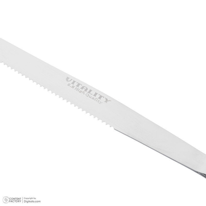 کارد و چنگال سرو " ویتالیتی " ابزار بسیارمناسبی برای سرو گوشت و بره و مرغ و بوقلمون بریانی میباشد و کارد آن با دنده های تیزی که دارد به راحتی برای شما برش ایجاد میکند و میتوانید پذیرایی لذت بخشی برای مهمانان عزیز خود داشته باشید.ضمنا جنس این محصول از استیل براق 18/10ضد زنگ با ضخامت3/5میلی متر بوده و قابل شستشو با ماشین ظرفشویی میباشد.
