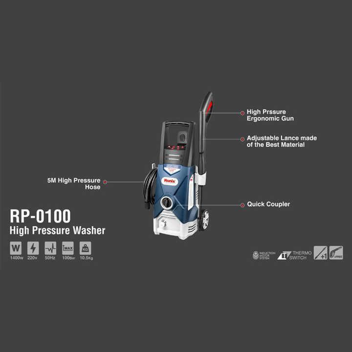 محصولی که مشاهده میکنید، کارواش مدل «RP-0100» است. این کارواش را یکی از شرکتهای داخلی تولید میکند. موتور در نظر گرفتهشده برای این محصول از قدرت قابلقبولی برخوردار است. طول شلنگ نیاز به جابهجایی محصول را در زمان استفاده کاهش میدهد؛ بااینحال جابهجایی این دستگاه با توجه به امکانات در نظر گرفتهشده، بسیار آسان است. شکل پاشش آب، توسط لوازم جانبی محصول قابلتنظیم است. این دستگاه ازجملهی محصولات شرکت «رونیکس» (Ronix) محسوب میشود. موتور این دستگاه از نوع القایی است و توانی برابر با 1400وات دارد. این قدرت موتور باعث میشود تا آب با فشار 100 بار و دبی 6.5 لیتر بر دقیقه از نازل کارواش خارج شود. طول شلنگ این محصول 5 متر است؛ بنابراین در زمان استفاده از کارواش نیاز چندانی به جابهجایی محصول پیدا نمیکنید. امکان اضافهکردن یک مخزن مواد شوینده به مسیر شستوشوی کارواش هم وجود دارد. برای تنظیم شکل پاشش آب باید از دو عدد لنس قابلتنظیم استفاده کنید. بهتازگی استفاده از کارواشهای خانگی رواج بیشتری پیدا کرده است. ازجمله دلایل این موضوع میتوان به افزایش اهمیت نظافت محیط زندگی، صرفهجویی در مصرف آب و هزینههای آن، کاهش نیاز مراجعه به کارواش جهت شستوشوی خودرو (و پرداخت هزینههای مکرر) و استفادهی راحت از این دستگاه اشاره کرد. شرکت رونیکس هم مدل RP-0100 را با در نظر گرفتن این موارد و با یک موتور 1400واتی تولید کرده است. این دستگاه آب را با فشار 100 بار در اختیار کاربر قرار میدهد.