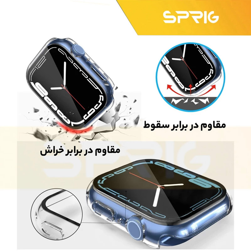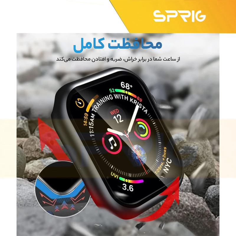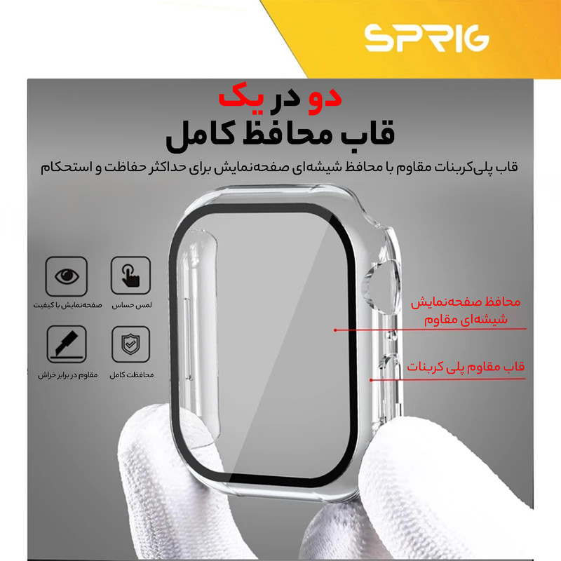 کاور اسپریگ مدل GUAR-DG ، بدنهای از جنس پلیکربنات دارد. این متریال نسبت به TPU سختتر بوده و با اینکه نسبت به آن انعطافپذیری کمتری دارد ولی محافظ قویتر و مستحکمتری محسوب میشود. هرچند سخت بودن این کاور اختلالی در نصب آن ایجاد نمیکند و با کمی دقت میتوان به آسانی آن را روی ساعت نصب نمود. برشکاری دقیق کاور در قسمت دکمهها و پورتها سبب شده تا در دسترسی به آنها محدودیتی ایجاد نشود. علاوه بر این ضخامت کم این محصول اپل واچ شما را بیش از حد برجسته نمیکند و کاملا با ابعاد ساعت هماهنگ است.گلس حرارتدیده متصل به این کاور نیز با بهرهگیری از یک طراحی هوشمندانه به خوبی فشار لمس را به صفحه نمایش ساعت انتقال میدهد و تا حد ممکن اختلالی در عملکرد تاچ ایجاد نمیکند.
