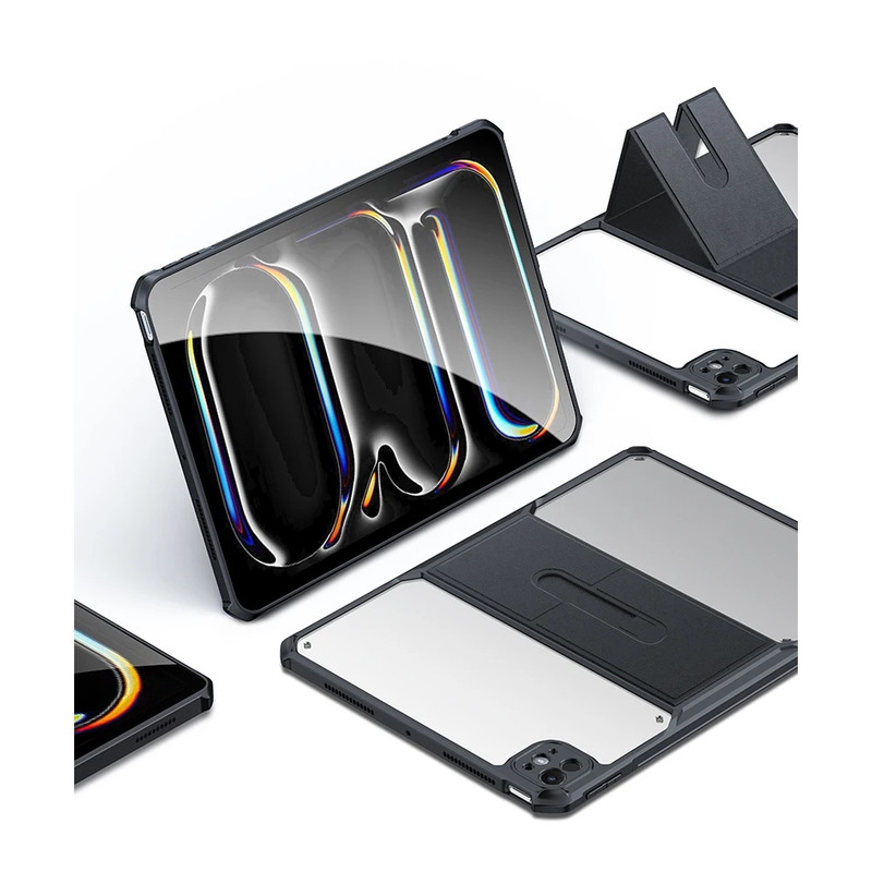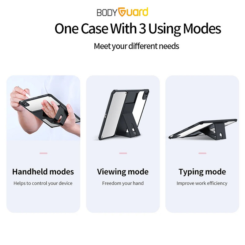 قاب بادیگارد مدل KickStand با بهره گیری از جدیدترین طراحی روز علاوه بر زیبایی امکان محافظت کامل از تبلت را نیز فراهم می کند. این کاور دارای کناره محکم و گوشه های کپسولی جهت حفاظت از تبلت در برابر صدمات می باشد. پشت این کاور طلق محکم شفاف می باشد که باعث حفظ زیبایی تبلت می شود. کاور KickStand دارای قسمت استند در پشت می باشد که باعث می شود تبلت در 3 حالت تماشای فیلم، حالت تایپ و حالت دستگیره ای جهت قرار گرفتن در کف قرار گیرد.