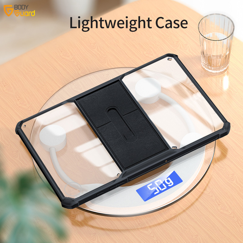 قاب بادیگارد مدل KickStand با بهره گیری از جدیدترین طراحی روز علاوه بر زیبایی امکان محافظت کامل از تبلت را نیز فراهم می کند. این کاور دارای کناره محکم و گوشه های کپسولی جهت حفاظت از تبلت در برابر صدمات می باشد. پشت این کاور طلق محکم شفاف می باشد که باعث حفظ زیبایی تبلت می شود. کاور KickStand دارای قسمت استند در پشت می باشد که باعث می شود تبلت در 3 حالت تماشای فیلم، حالت تایپ و حالت دستگیره ای جهت قرار گرفتن در کف قرار گیرد.