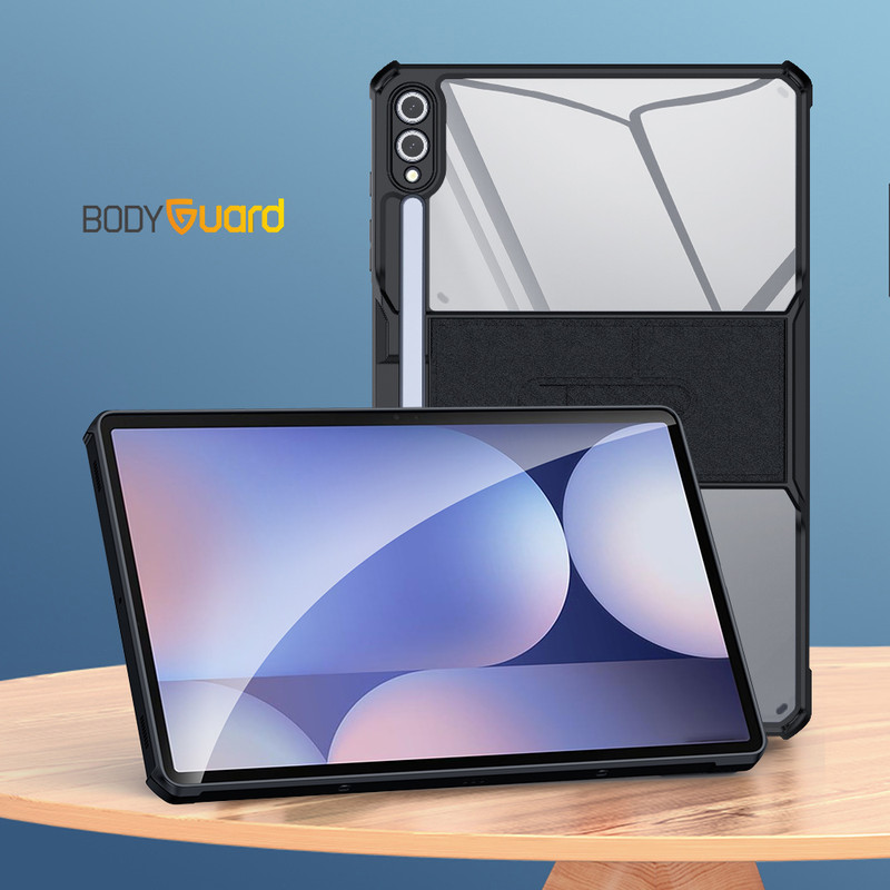 قاب بادیگارد مدل KickStand با بهره گیری از جدیدترین طراحی روز علاوه بر زیبایی امکان محافظت کامل از تبلت را نیز فراهم می کند. این کاور دارای کناره محکم و گوشه های کپسولی جهت حفاظت از تبلت در برابر صدمات می باشد. پشت این کاور طلق محکم شفاف می باشد که باعث حفظ زیبایی تبلت می شود. کاور KickStand دارای قسمت استند در پشت می باشد که باعث می شود تبلت در 3 حالت تماشای فیلم، حالت تایپ و حالت دستگیره ای جهت قرار گرفتن در کف قرار گیرد.