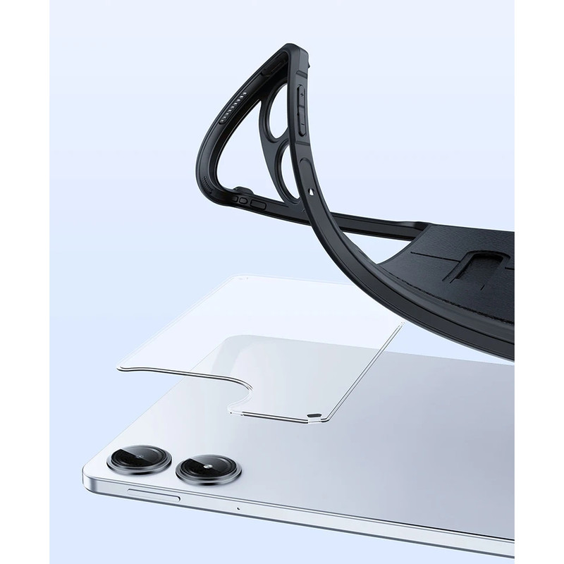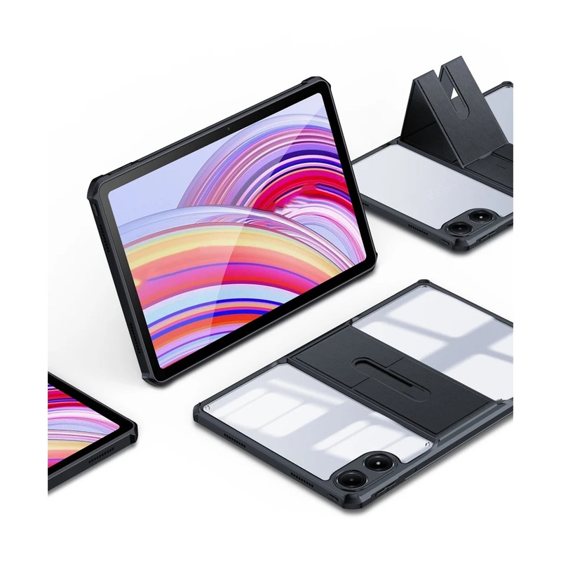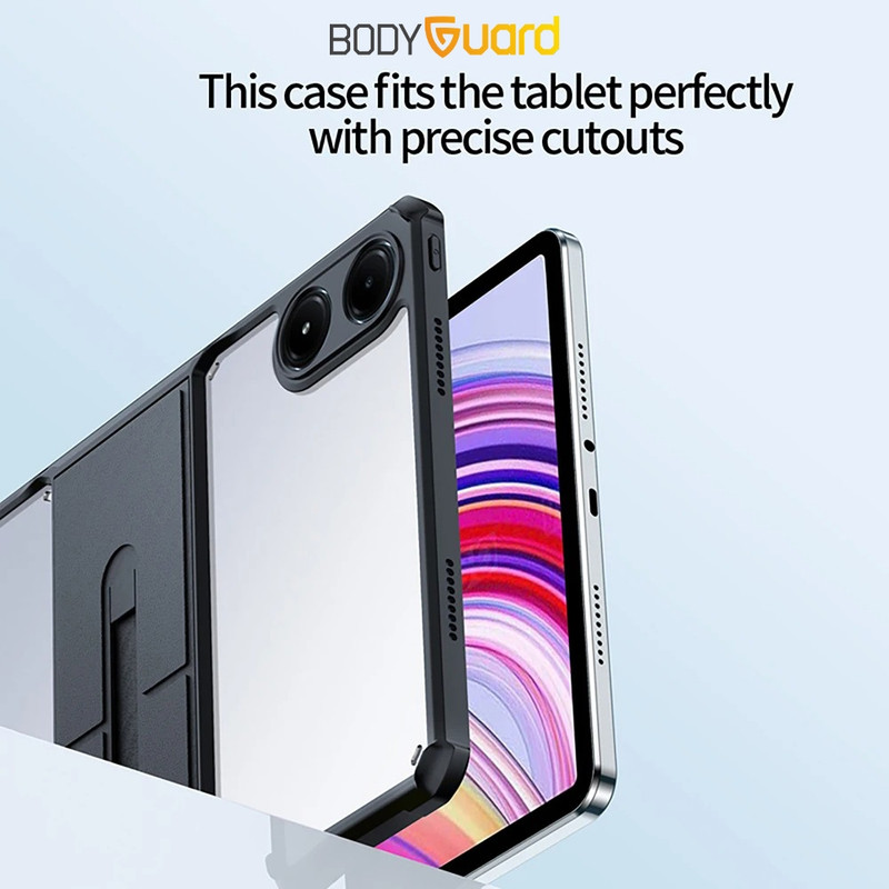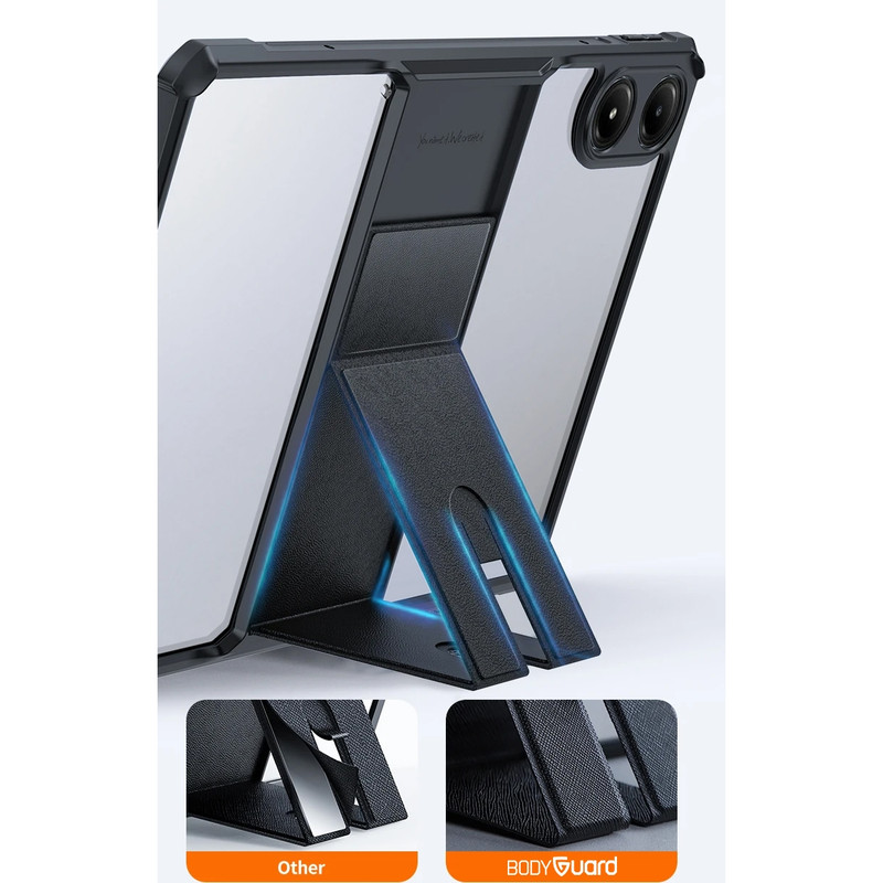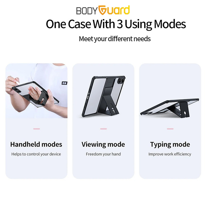 قاب بادیگارد مدل KickStand با بهره گیری از جدیدترین طراحی روز علاوه بر زیبایی امکان محافظت کامل از تبلت را نیز فراهم می کند. این کاور دارای کناره محکم و گوشه های کپسولی جهت حفاظت از تبلت در برابر صدمات می باشد. پشت این کاور طلق محکم شفاف می باشد که باعث حفظ زیبایی تبلت می شود. کاور KickStand دارای قسمت استند در پشت می باشد که باعث می شود تبلت در 3 حالت تماشای فیلم، حالت تایپ و حالت دستگیره ای جهت قرار گرفتن در کف قرار گیرد.