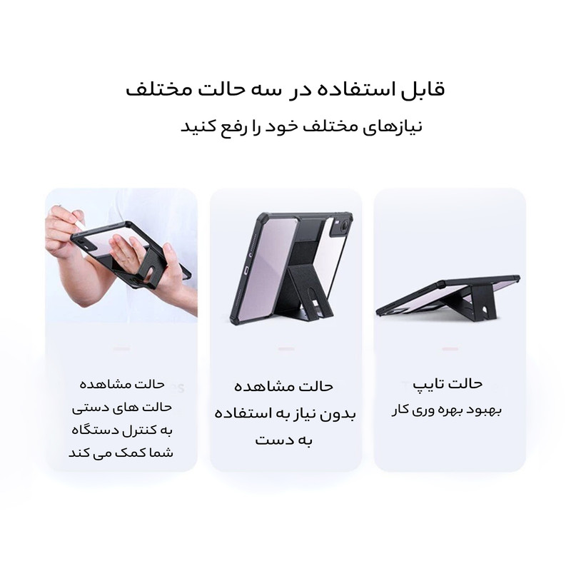 قاب بادیگارد مدل KickStand با بهره گیری از جدیدترین طراحی روز علاوه بر زیبایی امکان محافظت کامل از تبلت را نیز فراهم می کند. این کاور دارای کناره محکم و گوشه های کپسولی جهت حفاظت از تبلت در برابر صدمات می باشد. پشت این کاور طلق محکم شفاف می باشد که باعث حفظ زیبایی تبلت می شود. کاور KickStand دارای قسمت استند در پشت می باشد که باعث می شود تبلت در 3 حالت تماشای فیلم، حالت تایپ و حالت دستگیره ای جهت قرار گرفتن در کف قرار گیرد.