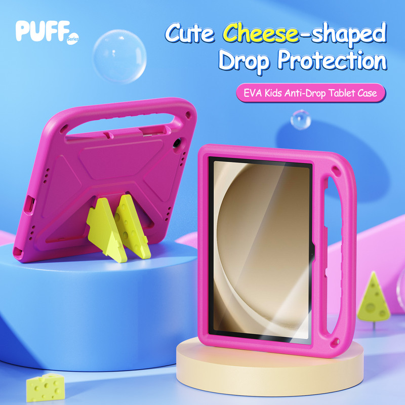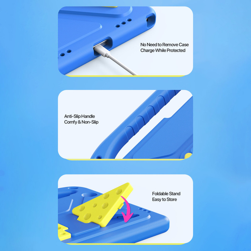 این قاب کودکانه از سری PUFF مخصوص تبلت Samsung Tab A9 Plus طراحی شده و با ظاهر رنگارنگ و پایه مثلثی شبیه پنیر، یک گزینه جذاب برای کودکان است. ساختهشده از متریال EVA نرم، این قاب مقاومت بالایی در برابر ضربه و سقوط دارد و لبههای تقویتشده آن از تبلت بهخوبی محافظت میکنند. دسته ضدلغزش با طراحی ارگونومیک، حمل آسان را برای کودکان فراهم کرده و پایه تاشو آن امکان تنظیم زاویه در حالتهای مختلف (۳۰ درجه برای نقاشی و ۶۰ درجه برای تماشا) را میدهد. قابلیت شستشو، ضدبو بودن و امکان شارژ بدون نیاز به باز کردن قاب نیز از دیگر ویژگیهای کاربردی این محصول است. طراحی فانتزی، سبک و کاربردی این قاب، آن را به انتخابی ایدهآل برای کودکان و والدین تبدیل کرده است.