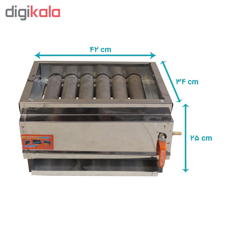 سایر توضیحات کباب پز رومیزی جنس بدنه استیل براق 0.5 جنس کلاف پروفیل آهن دارای شیر گازی استاندارد دارای سینی خاکستر دارای کفشک پلاستیکی دارای 6 ناودانی چدنی 24 سانتی متر سیستم ناودانی چدن جایگزین ذغال