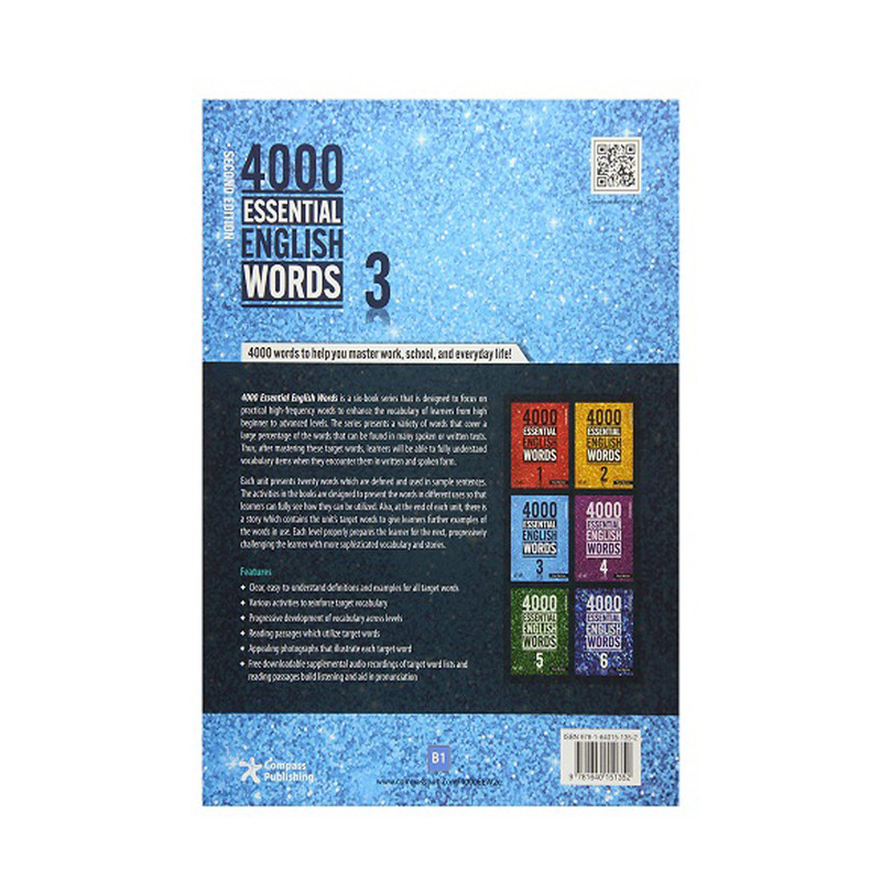 اگر به دنبال روشی خاص و مطمئن برای یادگیری و گسترش دایره لغات انگلیسی هستید و یا در حال آماده شدن برای شرکت در آزمون های مهمی همچون آیلتس یا تافل و... می باشید، بی شک به یک ابزار مناسب برای پیشبرد این اهداف نیاز خواهید داشت. کتاب 4000 Essential English Words 3 از سری شش گانه این مجموعه است که تمرکز آن بر روی آموزش لغات مهم و افزایش داریره لغات از سطح مبتدی تا پیشرفته ست. از جمله ویژگی های مهم این کتاب آموزش لغات همراه با مثال های بسیار قوی و مناسب می باشد. بنابراین، پس از تسلط بر کلمات هدف، فراگیران قادر به درک کامل واژگان خواهند بود که با آن ها در قالب نوشته و داستان آشنا خواهند شد. در هر بخش 20 کلمه ارائه می شود که هر کلمه دارای مثالی درج شده در جملات است. کتاب فوق شامل فعالیت هایی ست تا فراگیران بتوانند به خوبی مفهوم جملات را یاد بگیرند و به خاطر بسپارند. همچنین در پایان هر بخش، داستانی مرتبط با کلمات هدف در آن درس بیان شده تا دانش آموخته بتواند برای دروس بعدی کاملا آماده شود. ویژگی های اصلی این کتاب عبارتند از: • تعاریف و مثال های واضح و قابل درک می‌باشد. • دارای فعالیت های مختلف برای تقویت واژه های مورد هدف می‌باشد . • توسعه یافتن سطح سختی کلمات، همزمان با پیش روی دروس انجام می‌گیرد. • داستان های واقعی که کلمات هر درس را در بر می گیرند. • دارای تصاویر جذاب برای یادگیری بهتر کلمات هدف می‌باشد. • دارا بودن فایل های صوتی که در آن، داستان ها، کلمات هدف و تلفظ لغات ارائه شده است.