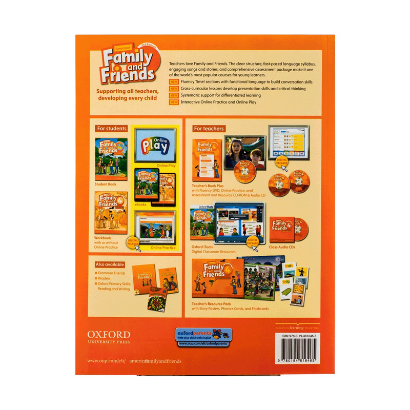 شرح کتاب American Family and Friends به صورت موارد ذکر شده ي زير است اين کتاب شامل 15 درس است که هر درس ميکوشد کودکان را با محيط پيرامونشان آشنا کند و آنها را با حيوانات،رنگ ها،اعداد،غذاها،نوشيدني ها و...آشنا کند. از ويژگي هاي بارز اين کتاب ميتوان به موارد زير اشاره کرد.از ويژگي هاي ظاهري اين کتاب ميتوان گفت که تمام کاغذها رنگي و گلاسه هستند. xدر ابتداي هر درس،ابتدا يک موضوع خاصي داده شده است که شامل متن ها و لغات متنوع زيادي ميشود. xدر بخش دوم،يک مبحث گرامري خاص آموزش داده شده است. xدر بخش سوم،فونيکس،الفبا،صداها و نحوه ي تلفظ آنها به صورت بسيار ساده آموزش داده شده است. xدر بخش چهارم،مهارتهاي داستان خواني،شناسايي اشياء در محيط اطراف و شناسايي چيزهاي مهم و پاسخ گويي به پرسش هاي درباره ي آنها. xاين سري کتابهاي درسي Family and Friends در دو سيستم و لحجه ي British and American تنظيم شده است. xاين سري از سطح Starter شروع و به سطح 6 تمام ميشود. کتابهاي مکمل تحت عنوان Oxford Primary Skills شامل مهارتهاي Reading and Writing ميشود که از همان ابتدا کلمات و جمله نويسي را تا پاراگراف نويسي آموزش ميدهد،و شامل 6 سري ميشود. xبراي هر کدام از اين کتابها،کتابهاي گرامر تحت عنوان Grammar Friends در 6 سطح طراحي شده است. xدر ضمن،اين کتابها شامل کتابهاي راهنماي تدريس براي مدرسان نيز ميشود. xهر کدام از اين کتاب ها،شامل Workbook نيز ميشود که تمام تمرينها و سوالات در آن نوشته شده است. xدر داخل هر کتاب دو CDصوتي قرار داده شده است. xتا کنون اين سري کتاب دو بار ويرايش شده است که کتاب کنوني ويرايش دوم است.