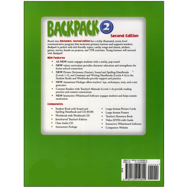 مجموعه backpack در هفت سطح (starter-6) یکی از بهترین مجموعه ها برای این رده سنی است که با استفاده از آهنگ های جذاب و ویدئوهای شاد یادگیری انگلیسی را برای زبان آموز جذاب می کند. مجموعه حاضر مکالمه محور(communicative base) و بر اساس CLIL است این ویژگی باعث افزایش دانش عمومی زبان آموز و یادگیری درس هایی مانند علوم و ریاضی به زبان انگلیسی می شود.