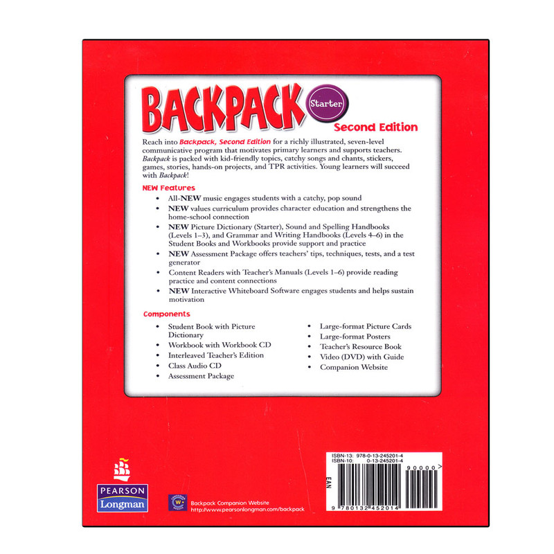 کتاب Backpack Starter 2nd Edition انتخاب هوشمندانه‌ای برای شروع آموزش زبان به کودکان و خردسالان است. کتاب حاضر یکی از کتاب‌های مجموعه‌ی BACKPACK است که در هفت سطح (starter-6) ارائه می‌شود. این کتاب به طور معمول در آموزشگاه‌ها و توسط مدرس تدریس می‌شود و انتخاب مناسبی برای خودآموزی نیست. آموزش به کودکان همیشه چالش برانگیز بوده خصوصا وقتی بحث زبانی جدید در میان باشد. والدین همیشه در تلاش‌اند تا فرزندشان از موقعیت‌های آموزشی خود به خوبی استفاده کند و فرصت گرانبهایی که می‌تواند صرف یادگیری شود از دست نرود. لذا اینکه نباید با آموزش‌های طولانی مدت و کسالت‌بار کودک را از یادگیری زده کرد. انتخاب منبع آموزشی مناسب از مهم‌ترین اقدامات والدین است و باید هوشمندانه انجام شود تا کودک حدالامکان آموزش غیر مستقیم یا آموزش متناسب با سن خود را برخوردار باشد. محتوای کتاب از طریق ویدیو و آهنگ‌های شاد و کودکانه آموزش داده می‌شود و بر اساس CLIL بوده و مکالمه محور (communicative base) بوده که این برای کودک بسیار مفید خواهد بود، زیرا یادگرفتن کلمات در کودکی سبب می‌شود لهجه Native داشته و علاوه بر آن، آموزشی که در کودکی رخ داده به سختی فراموش می‌شود. این کتاب دارای مکمل (Wokbook) بوده و لازم است همزمان با آموزش تمرینات کتاب کار حل شود تا آموزش به صورت کامل صورت گیرد.