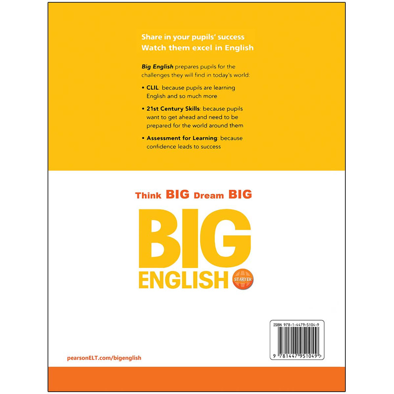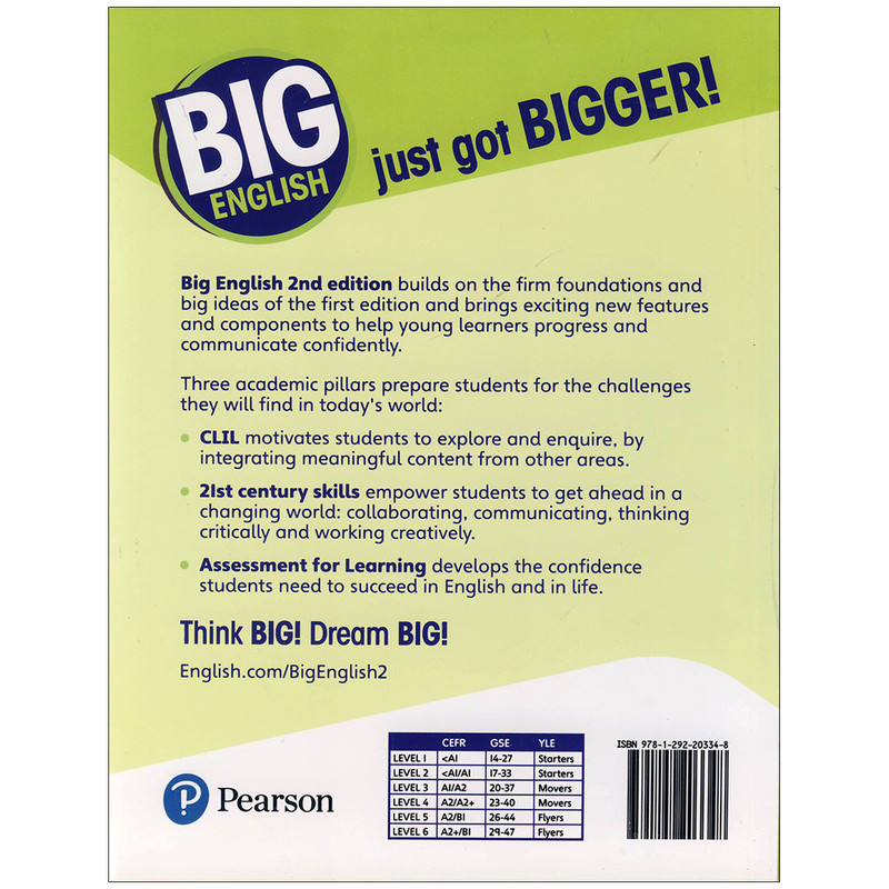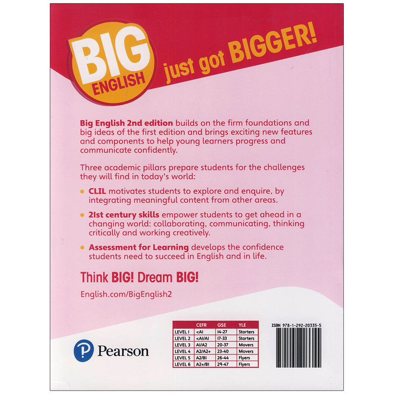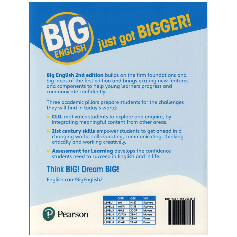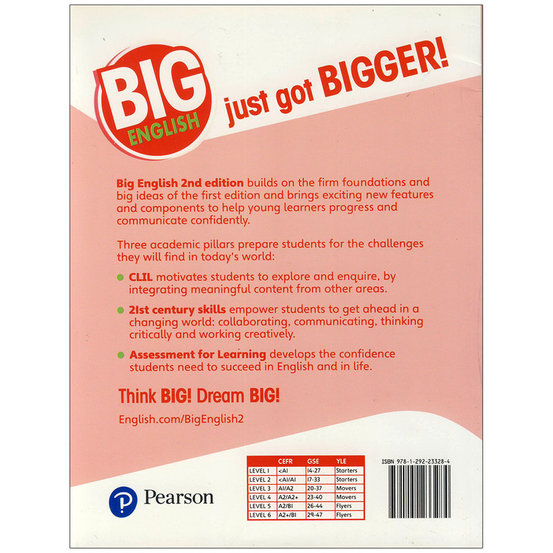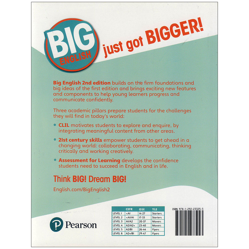 مجموعه کتاب های «Big English 2nd Edition » یک دوره آمورشی بسیار محبوب است که در شش سطح عرضه می گردد. این مجموعه که برای رسیدن به بهره وری سریع و بهترین نتیجه طراحی شده است، با ارائه یک برنامه آموزشی نوآورانه در راستای یادگیری زبان انگلیسی بر سه اصل یا ستون استوار است: یادگیری یکپارچه زبان و محتوا « CLIL »، ارزیابی یادگیری « AfL » و مهارت های کلیدی قرن بیست و یک. با خواندن این مجموعه ناب، زبان آموزان مهم ترین مهارت های عصر کنونی از جمله برقراری ارتباط و تعامل با دیگران، تفکر انتقادی، خلاقیت و سواد دیجیتال را می آموزند.