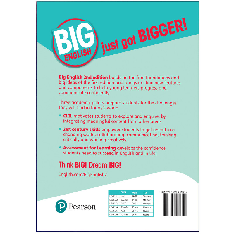مجموعه BIG English 2nd edition در هفت جلد (Starter- 6) سطح زبانی دانشآموزان رده سنی ۶ تا ۱۲ سال را از سطح A1 تا B1 ارتقاء میدهد. این مجموعه یکی از بهترین و کاملترین دورههای آموزش زبان انگلیسی است که تمام مطالب مورد نیاز برای تدریس را در اختیار مدرس قرار میدهد. مجموعه حاضر به خوبی دانشآموزان را از همان ابتدا برای آزمونهای YLE آماده میسازد بطوری که زبانآموزان در سطح ۶ این کتاب میتوانند با موفقیت آزمون Flyers را پشت سر بگذارند. ویژگیهای مهم این مجموعه شامل: استفاده از ویژگی CLIL (Content and Language Integrated Learning، افزایش مهارتهای قرن بیست و یکم زبانآموز، ارائه تصویری لغات مهم هر درس و کاربرد آن در شعر، ارائه گرامر در بافت ویدئوهای آموزشی میباشد. هر درس شامل دو فایل ویدئویی بر اساس موضوع درس است همچنین ویرایش دوم یک BIG TV. video+ video workbook نیز دارد که خود شامل ۵۲ ویدئو میشود. وجود بخش های BIG think با هدف تقویت مهارت تفکر انتقادی، شروع هر کتاب با یک درس Starter به منظور مرور مطالب مهم کتاب قبل و شروع هر درس اهداف آن درس را کاملا واضح مشخص کرده است. علاوه بر مروری که در انتهای هر درس آورده شده است یک مرور کلی در انتهای هر ۳ درس وجود دارد.