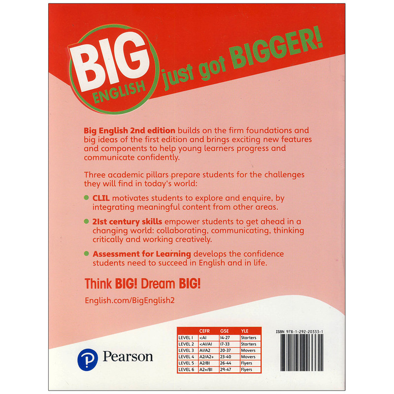 جموعه کتاب های «Big English 2nd Edition » یک دوره آمورشی بسیار محبوب است که در شش سطح عرضه می گردد. این مجموعه که برای رسیدن به بهره وری سریع و بهترین نتیجه طراحی شده است، با ارائه یک برنامه آموزشی نوآورانه در راستای یادگیری زبان انگلیسی بر سه اصل یا ستون استوار است: یادگیری یکپارچه زبان و محتوا « CLIL »، ارزیابی یادگیری « AfL » و مهارت های کلیدی قرن بیست و یک. با خواندن این مجموعه ناب، زبان آموزان مهم ترین مهارت های عصر کنونی از جمله برقراری ارتباط و تعامل با دیگران، تفکر انتقادی، خلاقیت و سواد دیجیتال را می آموزند.