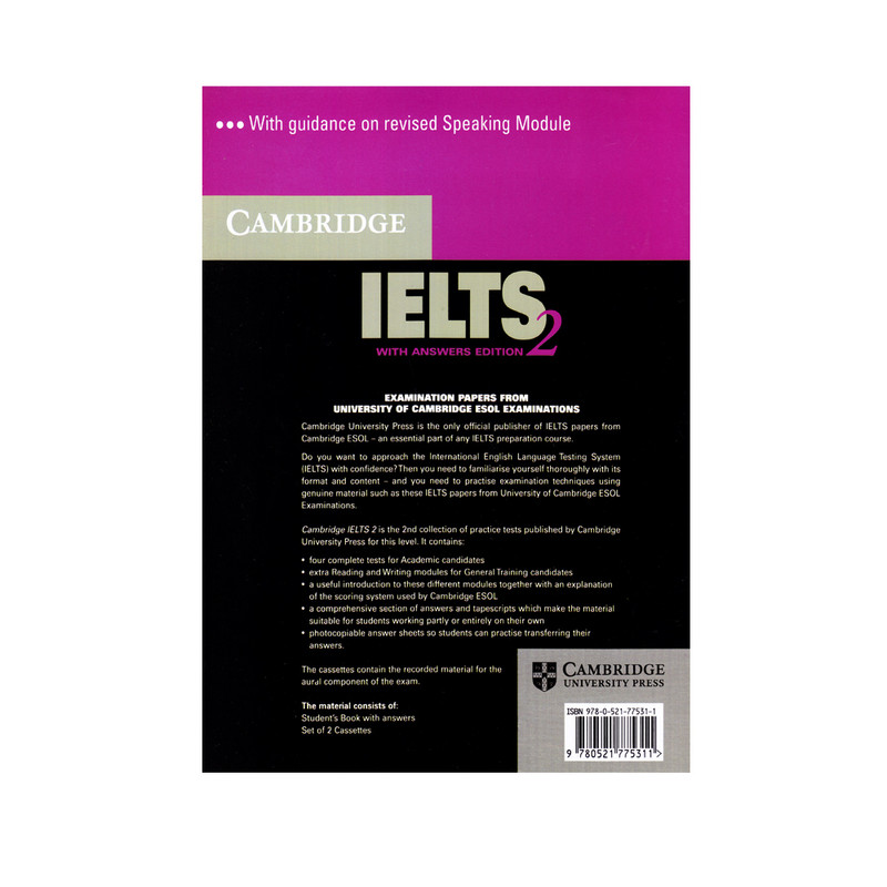 مجموعه اي از نمونه آزمون هاي آزمايشي آيلتس است که هر ساله توسط انتشارات کمبريج منتشر مي شود. اين کتاب مرجع کاملي از سوالات آزمون آيلتس همراه با پاسخ هاي آن مي باشد که شما با مطالعه آنها خود را براي شرکت در اين آزمون آماده خواهيد ساخت. همچنين همراه اين کتاب، فايل هاي صوتي مرتبط با آن نيز با فرمت MP3 در اختيار زبان آموزان قرار گرفته است که مربوط به بخش Listening آزمون مي شود. در پايان کتاب متن اين Listening ها نيز Transcript شده است. شروع هر کتاب با معرفي آزمون آيلتس و نحوه نمره دهي و تفاوت آزمون آکادميک و جنرال آغاز مي شود و در انتهاي کتاب پاسخ نامه تمام تست ها و نمونه هاي writing و متن کامل listening قرار دارد . وجود بخش پاسخ نامه در اين کتاب، کتاب را براي مطالعه خودخوان و يا مطالعه آن در کلاس مناسب کرده است. ويژگي هاي اصلي: کتاب Cambridge IELTS با پاسخ تست ها همراه است و شامل 4 آزمون ميشود. بخش Listening شامل 4 بخش، حدود 40 سوال که 30 دقيقه زمان ميبرد. بخش Reading شامل 3 بخش، حدود 40 سوال که 60 ذقيقه زمان ميبرد. بخش Writing شامل 2 تست که 60 دقيقه زمان ميبرد. بخش Speaking شامل 10 تا 15 دقيقه زمان ميبرد.