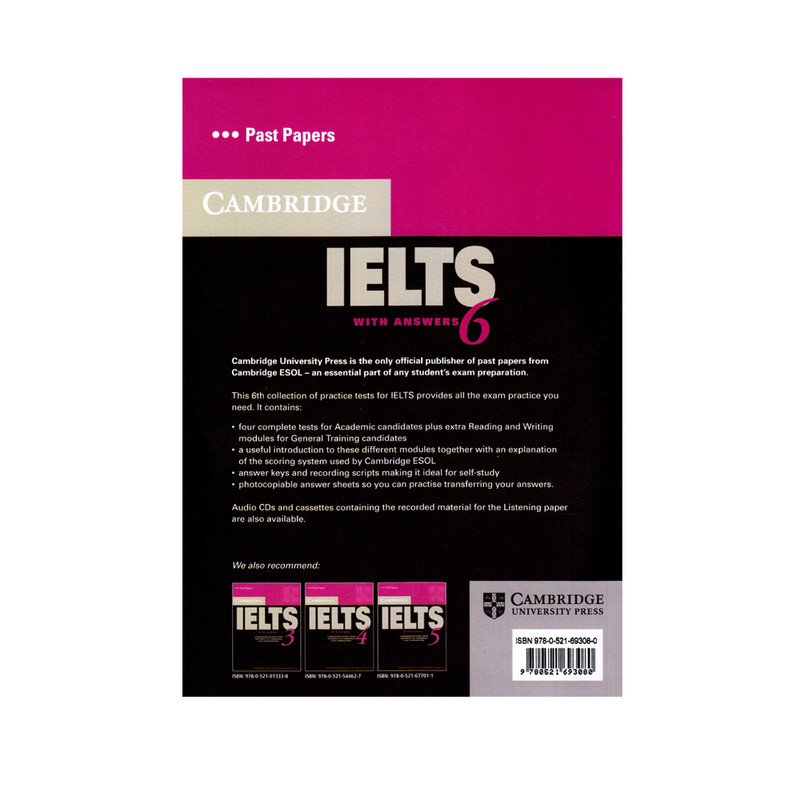 مجموعه اي از نمونه آزمون هاي آزمايشي آيلتس است که هر ساله توسط انتشارات کمبريج منتشر مي شود. اين کتاب مرجع کاملي از سوالات آزمون آيلتس همراه با پاسخ هاي آن مي باشد که شما با مطالعه آنها خود را براي شرکت در اين آزمون آماده خواهيد ساخت. همچنين همراه اين کتاب، فايل هاي صوتي مرتبط با آن نيز با فرمت MP3 در اختيار زبان آموزان قرار گرفته است که مربوط به بخش Listening آزمون مي شود. در پايان کتاب متن اين Listening ها نيز Transcript شده است. شروع هر کتاب با معرفي آزمون آيلتس و نحوه نمره دهي و تفاوت آزمون آکادميک و جنرال آغاز مي شود و در انتهاي کتاب پاسخ نامه تمام تست ها و نمونه هاي writing و متن کامل listening قرار دارد . وجود بخش پاسخ نامه در اين کتاب، کتاب را براي مطالعه خودخوان و يا مطالعه آن در کلاس مناسب کرده است. ويژگي هاي اصلي: کتاب Cambridge IELTS با پاسخ تست ها همراه است و شامل 4 آزمون ميشود. بخش Listening شامل 4 بخش، حدود 40 سوال که 30 دقيقه زمان ميبرد. بخش Reading شامل 3 بخش، حدود 40 سوال که 60 ذقيقه زمان ميبرد. بخش Writing شامل 2 تست که 60 دقيقه زمان ميبرد. بخش Speaking شامل 10 تا 15 دقيقه زمان ميبرد.