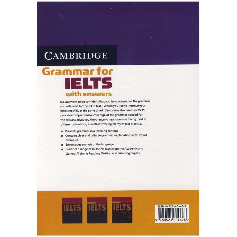کتاب Cambridge Grammar for IELTS تمام قواعد گرامری که برای حل تست های آزمون آیلتس لازم دارید در اختیار شما قرار داده و همزمان به تقویت مهارت لسنینگ شما کمک می کند. محتوای کتاب شامل، طیف گسترده ای از تسک های آزمون آیلتس از منابع آموزشی آکادمیک و عمومی بوده، بخش های ریدینگ، رایتینگ و لسنینگ را شامل شده. علاوه بر این توضیحات مفید گرامری و واژه نامه ای گرامری نیز در کتاب وجود دارد.