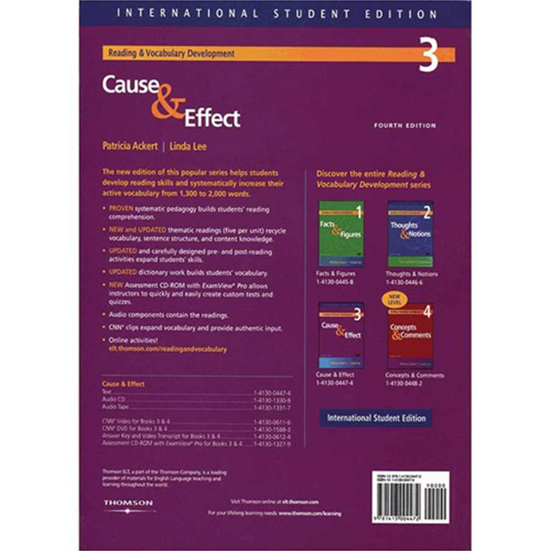 کتاب Cause & Effect 3 برای تقویت مهارت reading و یادگیری لغات انگلیسی سطح Intermediate طراحی شده است.این کتاب همراه با سی دی آموزشی عرضه شده است که در آن فایل صوتی کلیه reading ها موجود است و امکان شنیدن تلفظ صحیح لغات وجود دارد.