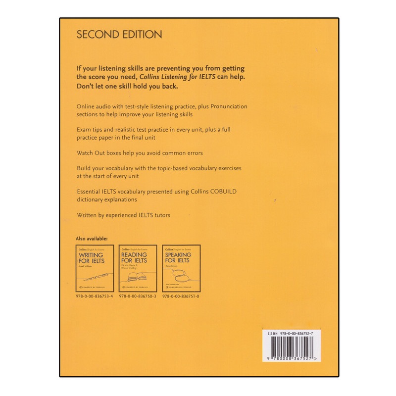 پیش از این، کتاب Collins English for Exams Listening for Ielts نکات و توصیه‌های خوبی برای دانش‌آموزان و داوطلبان آزمون آیلتس عرضه کرده بود، اما در ویرایش جدید این کتاب یعنی Collins Listening for IELTS 2nd Edition ویژگی‌های جدیدی به نسخه قبلی افزوده شده که نسبت به ویرایش قبلی به آن برتری می‌دهد. کتاب Collins Listening for IELTS 2nd Edition تمام رنگی است و در 12 فصل تمام نکات و موضوعاتی که ممکن است در آزمون آیلتس با آن مواجه شوید را ذکر می‌کند و در کادرهای جداگانه تمارین مفید و اطلاعاتی برای تلفظ صحیح را گوشزد می‌کند. بخش Watch out که جدیدا اضافه شده، دانش‌آموز را نسبت به اشتباهات رایج در آزمون شنیداری آگاه می‌کند و با وجود پاسخنامه کامل و جامع این کتاب که به همراه توضیحات تکمیلی ارائه شده، این کتاب به عنوان یک کتاب خودخوان نیز قابل استفاده است.