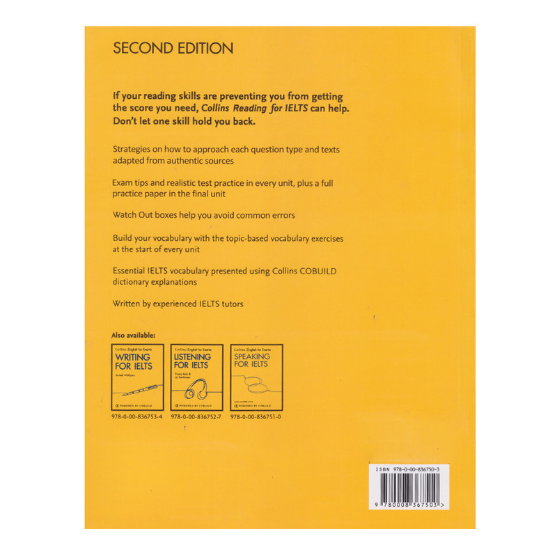 کتاب Collins Reading for IELTS 2nd Edition ویرایش جدید و ارتقا یافته کتاب Collins English for Exams Reading for Ielts است و علاوه بر ویژگیهای قبلی مانند آشنا کردن کامل دانشآموز با قالب سوالات خواندنی آزمون آیلتس و قابلیت استفاده به صورت خودخوان یا استفاده در کلاس، این ویرایش جدید کاملا رنگی است که جذابیت بیشتری برای زبانآموز ایجاد میکند و از طرفی بخشهای جدیدی مانند کادرهای Watch out که غلطهای رایج آزمون را نشان میدهد در این ویرایش وجود دارند. این کتاب که شامل 12 فصل است برای داوطلبین آزمون آیلتس آکادمیک مفید خواهد بود و به داوطلب کمک خواهد کرد که نمره 5 یا 5.5 خود در بخش خواندن را به 6 و یا حتی بالاتر برساند. با وجود پاسخنامه کامل و جامع این ویرایش از کتاب Collins Reading for IELTS 2nd Edition، این کتاب برای self-study ایدهآل است و توضیحات تکمیلی این پاسخنامه بیش از پیش برای دانشآموزان روشنگر خواهد بود