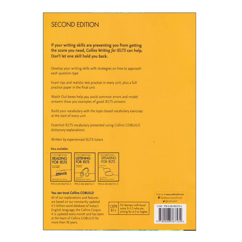 کتاب Collins Writing for IELTS 2nd Edition به صورت تخصصی برای داوطلبانی طراحی شده که نمره آزمون بخش نوشتاری آنها 5 تا 5.5 است و مایلند این نمره را به 6 یا بالاتر برسانند.