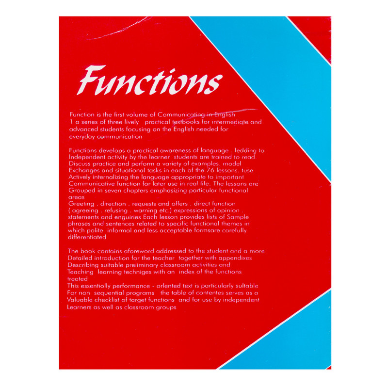 کتاب Functions یک متد آموزش زبان به همراه متون کاربردی و زنده برای زبان آموزان سطوح متوسط تا پیشرفته میباشد که توجه اصلی اش را بر روی تقویت مهارت ارتباط برقرار کردن در مکالمه های روزانه قرار داده است. این کتاب یکی از پر طرفدارترین دوره ها در زمینه خود میباشد که زبان آموزان به راحتی میتوانند با آن ارتباط برقرار کنند. مجموعه Functions آگاهی کاربردی از زبان انگلیسی را در زبان آموزان تقویت میکند و منجر به انجام فعالیت مستقل توسط زبان آموز میشود، همچنین زبان آموز وادار به تمرین، مباحثه، خواندن و انجام دادن تعداد مختلفی از مثال ها، میشود که قدمی مهم دریادگیری سطح پایه زبان انگلیسی میباشد.
