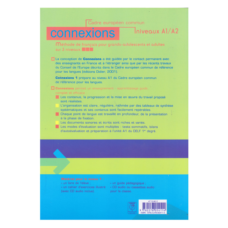 کتاب Connexions Methode de francias niveau 1 یکی از کتابهای مجموعه Connexions Methode de fracias میباشد. این مجموعه توسط Regine Merieux و Yves Loiseau نوشته شده است.این مجموعه دارای 3 کتاب بوده که از سطح A1 (Starter) آغاز و تا سطح B2 (Intermediate) ادامه دارد و هم برای آموزش توسط مدرس و استفاده در آموزشگاهها و هم برای خودآموزش مناسب است.تصاویر مرتبط با مطالب مورد آموزش سبب میشود تا مطالب بهتر در ذهن ماندگار شوند. فایل صوتی ضمیمه کتاب نیز باعث میشود تلفظ صحیح کلمات در دسترس مخاطب بوده و با گوش دادن مکرر بخشهای مختلف کتاب مشکلی در تلفظ جملات و کلمات نداشته باشد.همچنین کتابکار ضمیمه کتاب نیز با تمارین متنوع و متعدد باعث میشود تا مخاطب با انواع سوالتی که ممکن است در هر حوزه پیش بیاید رو به رو شود و به تمام جوانب تسلط پیدا کند.