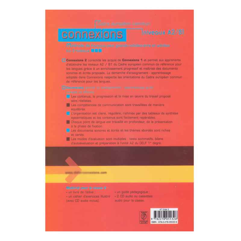 کتاب Connexions Methode de francias niveau 2 یکی از کتابهای مجموعه Connexions Methode de fracias میباشد. این مجموعه توسط Regine Merieux و Yves Loiseau نوشته شده است.این مجموعه دارای 3 کتاب بوده که از سطح A1 (Starter) آغاز و تا سطح B2 (Intermediate) ادامه دارد و هم برای آموزش توسط مدرس و استفاده در آموزشگاهها و هم برای خودآموزش مناسب است.تصاویر مرتبط با مطالب مورد آموزش سبب میشود تا مطالب بهتر در ذهن ماندگار شوند. فایل صوتی ضمیمه کتاب نیز باعث میشود تلفظ صحیح کلمات در دسترس مخاطب بوده و با گوش دادن مکرر بخشهای مختلف کتاب مشکلی در تلفظ جملات و کلمات نداشته باشد.همچنین کتابکار ضمیمه کتاب نیز با تمارین متنوع و متعدد باعث میشود تا مخاطب با انواع سوالتی که ممکن است در هر حوزه پیش بیاید رو به رو شود و به تمام جوانب تسلط پیدا کند.