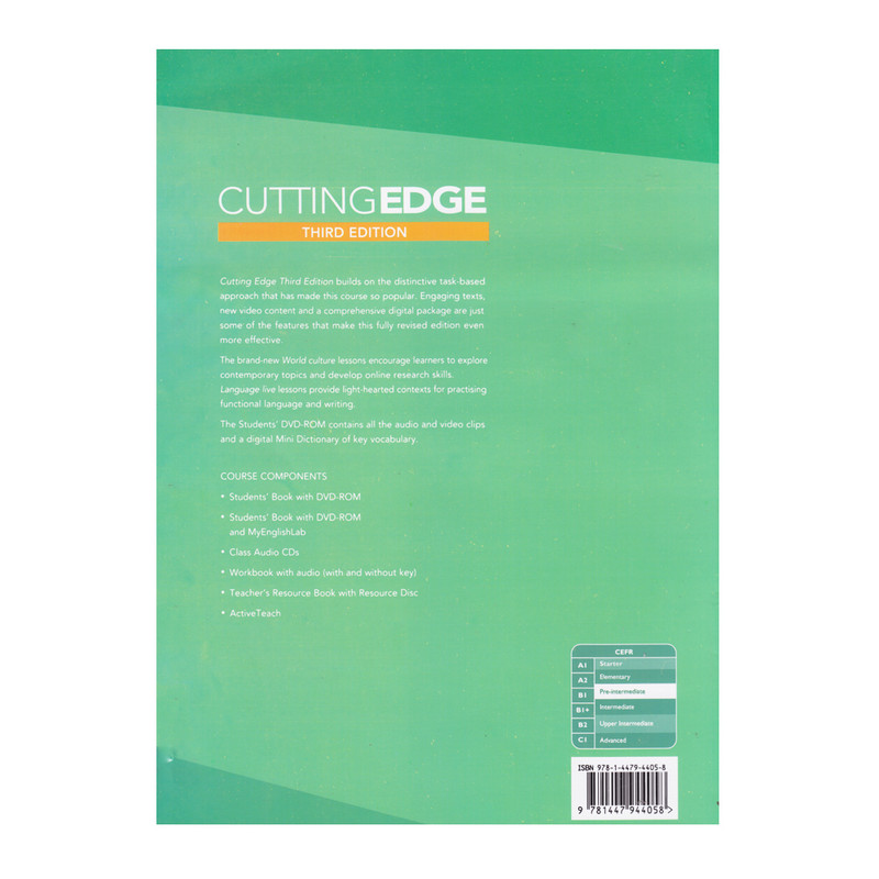کتاب Cutting Edge 3rd Edition Pre-Intermediate سومین کتاب از مجموعه‌ی 6 جلدی Cutting Edge است. هدف از طراحی این مجموعه، بهبود و ارتقای مهارت‌های اصلی زبان انگلیسی- مثل Grammar، Vocabulary، Pronunciation و…- با استفاده از تمرینات کاربردی بوده و برای بزرگسالانی که قصد یادگیری زبان انگلیسی را دارند، مورد استفاده قرار می‌گیرد.این مجموعه با ارائه‌ی موضوعات متنوع، کاربردی و روزمره باعث تقویت توانایی زبان‌آموزان در مهارت‌های مختلف مثل مهارت‌های گفتاری و شنیداری می‌شود.کتاب Cutting Edge 3rd Edition Pre-Intermediate