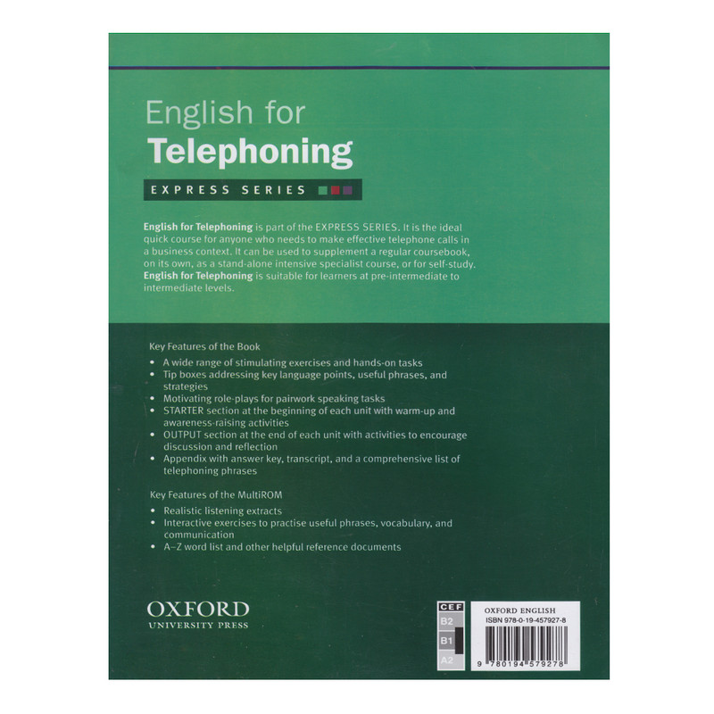 کتاب English for Telephoning یکی از کتاب های مجموعه Oxford Express Series است که مجموعه از دوره های آموزشی نسبتا کوتاه برای مشاغل مختلف، مهارت های کاری و صنایع است. این دوره های نسبتا کوتاه را می توان با ۲۵-۳۰ ساعت مطالعه تکمیل کرد تا زبان آموزان بتوانند به سرعت پیشرفت کنند. از کتاب های این مجموعه هم میتوان به صورت تنها برای خودخوانی و یا در کنار یک کتاب آموزشی دیگر استفاده کرد.