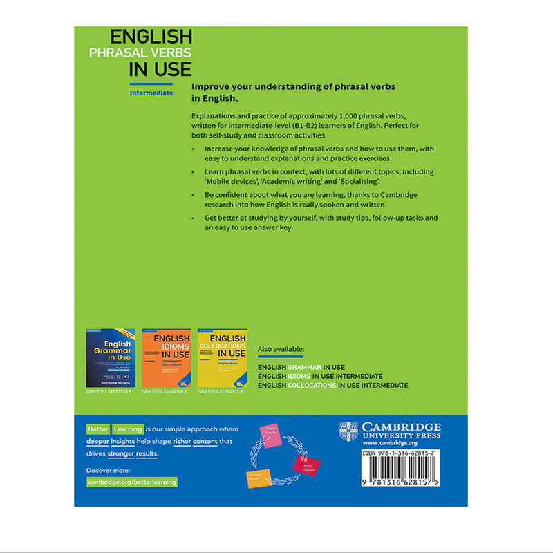 اگر به دنبال یک منبع بسیار خوب برای تقویت واژگان خود هستید مجموعه کتابهای English Phrasal Verbs in Use مجموعهای بسیار مفید و کاربردی میباشد که توسط انتشارات کمبریج به چاپ رسیده و برای زبانآموزانی که میخواهند روی افعال ترکیبی کار کنند بسیار مناسب میباشد. لازم به ذکر است کتاب سطح متوسط این مجموعه دارای 70 درس و کتاب سطح پیشرفته داری 60 درس میباشد و دروس نخستین هر یک از کتابهای English Phrasal Verbs in Use سعی میکنند به مباحث و مفاهیم مرتبط با افعال ترکیبی بپردازند که توصیه میشود حتماً این دروس را در ابتدا مطالعه نمایید.