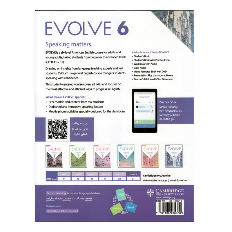 EVOLVE یک دوره انگلیسی شش سطحی است که دانش آموزان را با اطمینان صحبت می کند. کتاب منبع ویدئویی سطح 6 (CEFR C1) بسته ای متشکل از یک DVD و یک کتاب همراه با فعالیت ها و یادداشت های آموزشی است. دی وی دی شامل مستندهای کوچک و مصاحبه با افراد متخصص غیر بومی انگلیسی است. همه ویدیوها در سطح مناسب و از نظر موضوعی مربوط به واحدهای کتاب دانشجویان است. کاربرگها همراه با هر ویدئو و یادداشتهای آموزشی برای هر کاربرگ، معلم را از طریق فعالیتها راهنمایی میکند.