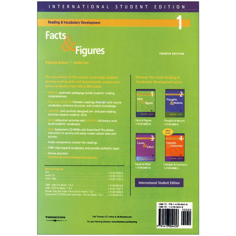سری کتب Facts & Figures دارای چهار سطح است که هرکدام از دروس های کتاب به موضوعات رایجی مانند گیاهان، حیوانات، سرگرمی و غیره می پردازد. این سری برای تقویت سطح واژگان و اشنایی با ساختار جملات رایج و ارائه بافت های لازم برای درک مطلب بهتر تالیف شده است. هر سطح شامل تمرین هایی متناسب با درون مایه دروس است. این کتاب برای کسانی که درباره یادگیری مسائل رایج و موضوعات عام دغدغه دارند، بسیار گزینه مناسبی است.