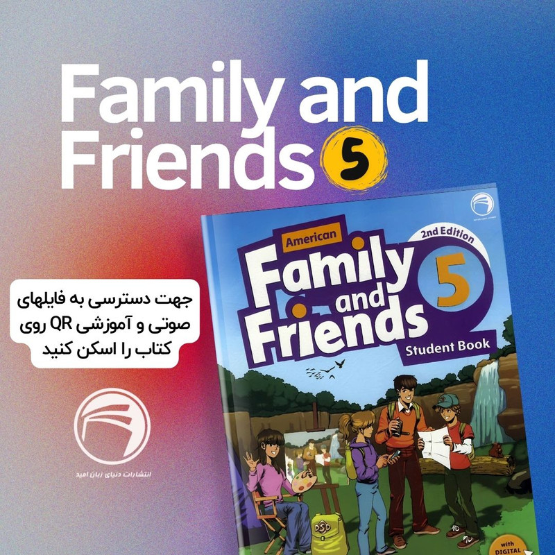 کتاب معروف Family and Friends 5 Second Edition با سطح بندی دقیق، آموزش مهارتهای اسپیکینگ، رایتینگ و لیسنینگ زبان انگلیسی را به زبان آموزان ارائه میدهد. کتاب فمیلی فرندز مخصوص کودکان و در سطح پایه طراحی شده است؛ به طوری که شاید هیچ دوره و کتاب دیگری مانند آن برای آموزش زبان انگلیسی به کودکان در این سن مفید نباشد. درسهای آموزشی این مجموعه کتابها، متمرکز بر تقویت مهارتهای گفتاری و نوشتاری است. در این مجموعه 2 جلدی برای کمتر شدن هزینه کتاب، نسخه DVD حذف شده و به جای آن از کیو آر کد استفاده شده است که با اسکن هر کیو آر کد به صورت رایگان به نسخه های صوتی و تصویری دسترسی خواهید داشت این مجموعه با کیفیت چاپ بسیار خوبی( رنگی مصور ) توسط نشر دنیای زبان امید تولید و توزیع شده است که هر درس شامل آموزش لغات همراه با آهنگ، شعر و داستان با لهجهٔ امریکن است. تدریس گرامر و لغات در قالب جملات، کودک را برای مکالمههای ساده در خانه و محیطهای مختلف و برقراری ارتباط با دوستان آماده میکند.