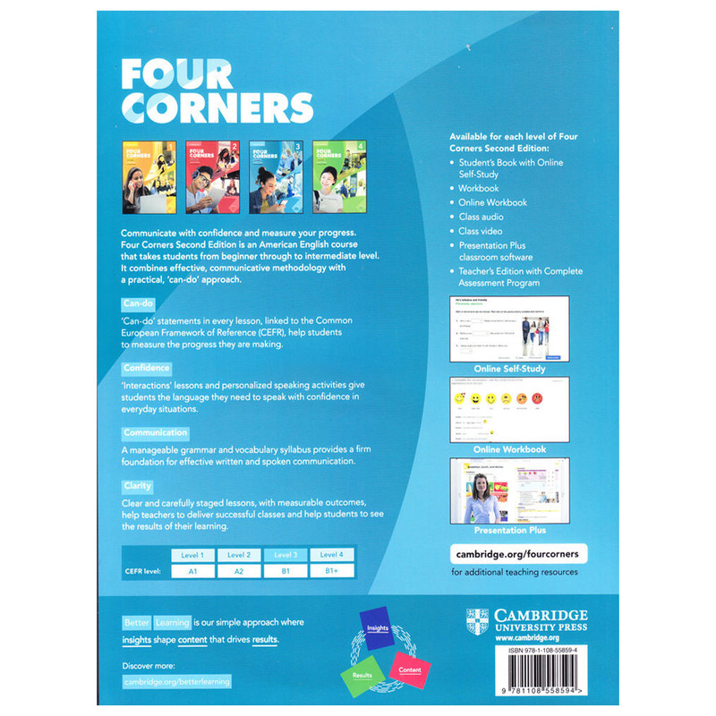 کتاب Four Corners مطابق با سیستم آمریکایی بوده و امروزه یکی از پرطرفدارترین کتاب های آموزشی در سرتاسر جهان است. این کتاب بر چهار مهارت اصلی به میزان مساوی متمرکز بوده و مناسب آن دسته از افرادی است که مشتاق یادگیری زبان انگلیسی در زمان کوتاه و به بهترین نحو ممکن می‌باشند. هر بخش از کتاب شامل ارائه واژگان جدید، دستورزبان کاربردی و خوانش‌های مناسب با انها می باشد. همانطور که گفته شد کتاب حاضر درصدد آن است تا با ارائه دروسی جامع و هدفمند مهارت‌های چهارگانه را بی کم و کاست پوشش داده و آموزشی پویا و جذاب را فراهم آورد.