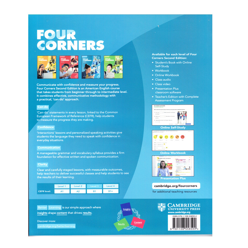 کتاب Four Corners به صورت موضوعی و سازمان یافته برای زبان آموزان و مدرسان در موسسات ارائه می شود. موضوعی که کتاب Four Corners را پوشش می دهد مباحث مورد علاقه بسیاری از زبان آموزان است (موضوعاتی مثل محیط شهری یا روستایی، چهره های بین المللی و ..) محتوای کتاب: محتوای کتاب نیز بر اساس نیاز دانش آموزان یا الزامات برنامه درسی موجود طبقه بندی می شود. دروس، به صورت ساختاری هستند. به این معنی که د...
