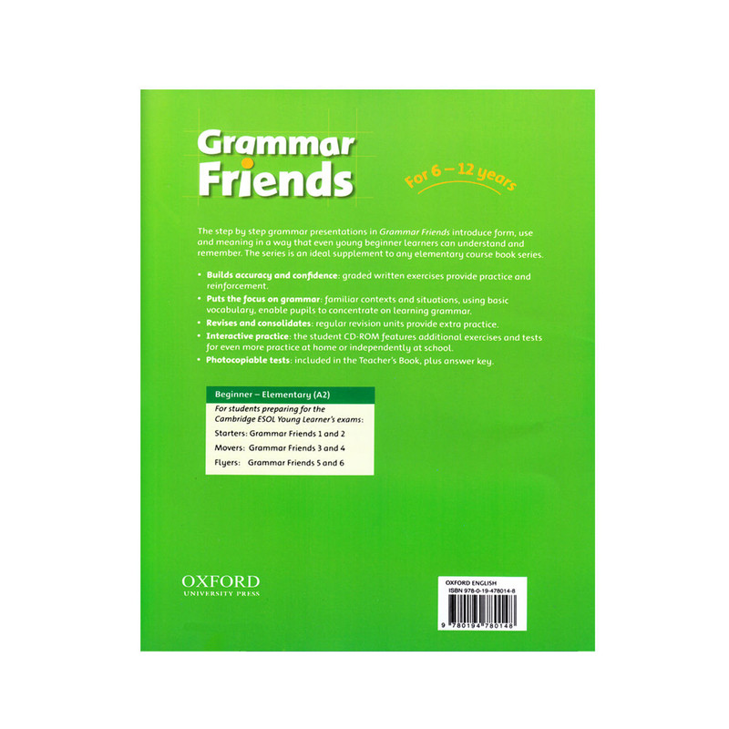 Grammar Friends یک مجموعه شش سطحی است که با تمزکز بیشتر برای آموزش گرامر زبان انگلیسی به کودکان و نوجوانان طراحی گردیده است. هر سطح از کتاب دربردارنده 15 درس در موضوعات گرامری و کاربری است که به صورت تمرین و پاسخ ارائه می شود. - این محصول علاوه بر کتاب شامل یک CD نرم افزار است که برای تمرین ها و تست های بیشتر در منزل و یا کلاس درس طراحی گردیده است.