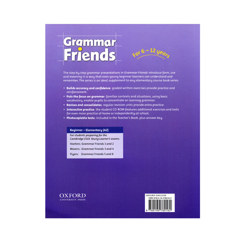 Grammar Friends یک مجموعه شش سطحی است که با تمزکز بیشتر برای آموزش گرامر زبان انگلیسی به کودکان و نوجوانان طراحی گردیده است. هر سطح از کتاب دربردارنده 15 درس در موضوعات گرامری و کاربری است که به صورت تمرین و پاسخ ارائه می شود. - این محصول علاوه بر کتاب شامل یک CD نرم افزار است که برای تمرین ها و تست های بیشتر در منزل و یا کلاس درس طراحی گردیده است.