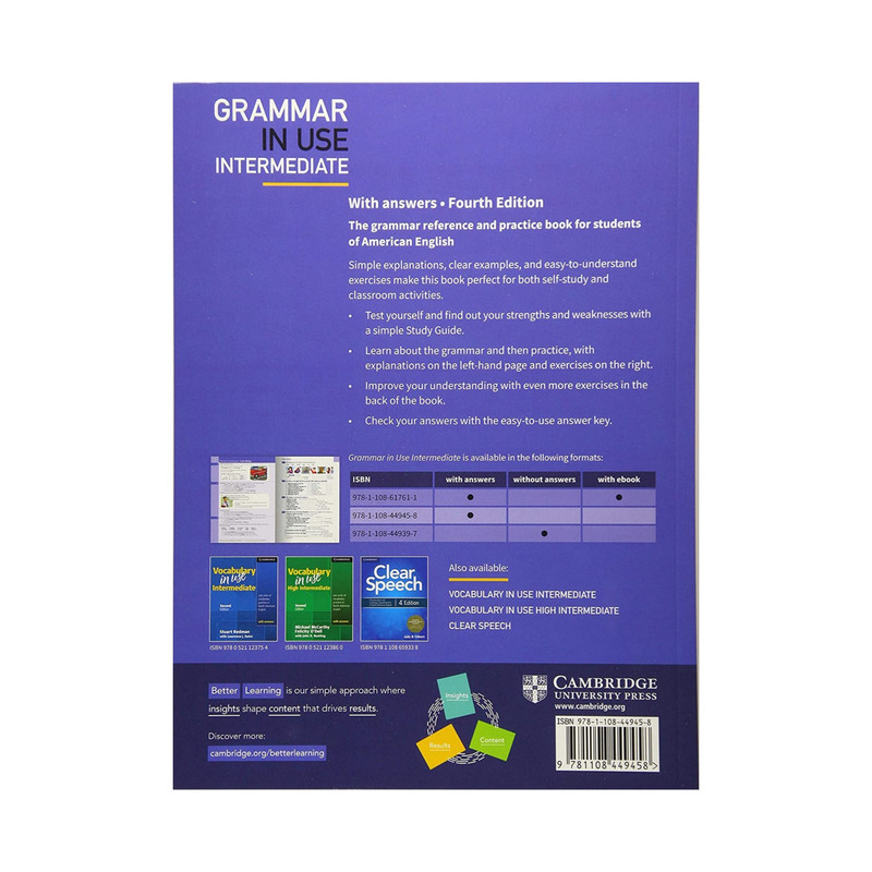 مجموعه Grammar In Use منبعی بسیار سودمند برای فراگیری دستور زبان است که هر درس آن متشکل از تمرین ها و نکات اضافی دستوری برای یادگیری آسان و جذاب می باشد. این کتاب دارای کتاب دانش آموز، کتاب معلم، و یک سی دی آموزشی برای تمرین های کتاب به خصوص تمرین های شنیداری است. این مجموعه دارای یک نرم افزار نیز می باشد که از طریق آن می توانید به تمام بخش های کتاب دسترسی آسان داشته باشید.