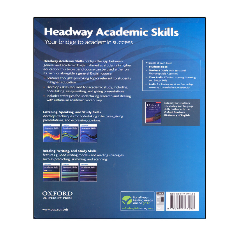 مجموعه کتابهای Headway Academic Skills در 4 سطح و برای زبان آموزان سطح پیش متوسطه تا فوق متوسطه طراحی شده است. این کتاب برای تقویت listening و speaking و همچنین reading و writing نوشته شده و حاوی موضوعات و مطالب متنوع و مرتبط با تحصیلات آکادمیک است. انواع استراتژی هایی که در خصوص مهارت خواندن و نوشتن در این کتاب معرفی می شوند شامل نت برداری، نوشتن انشا و همچنین ارائه presentation به زبان انگلیسی است. در این کتابها استراتژیهای مربوط به انجام تحقیق و کنار آمدن با لغات نا آشنای آکادمیک نیز آموزش داده میشوند