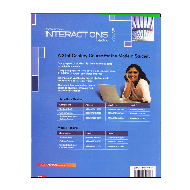 کتابهاي Interactions زبان آموزان را براي ورود به کلاسهاي دانشگاه با در نظر گرفتن تمام ابعاد زندگي دانش آموز از نت برداري از صحبتهاي استاد گرفته تا تجزيه تحليل کتابهاي درسي براي انجام تکاليف آنلاين، آماده ميسازد.محتواي اين کتابهاي آموزشي بسيار به روز است و موضوعاتي را انتخاب ميکنند که بسيار جذاب و مرتبط با زندگي روزمرهي دانش آموزان هستند و مهارتهاي خوانش و لغات افراد را بهبود ميبخشند. ويژگيهاي برجستهي اين مجموعه: • محتواي به قدر کافي جهاني قانعکننده • به همراه داشتن نسخهي صوتي کامل با کتاب دانش آموزان • تمرکز بر بخش آزمونها براي آمادگي و موفقيت دانش آموزان در آزمونهاي TOEFL iBT به وسيلهي ارائه و تمرين بر روي انواع سوالات کليدي • تمرکز بر لغات از لغات پر استفاده و پيشنهاد شده در ليست لغات آکادميک گرفته تا تمرين لغاتي که دانش آموزان بيشتر ممکن است در روابط اجتماعي و گفتگوي روزمره يا در متون آکادميک با آنها برخورد کنند.