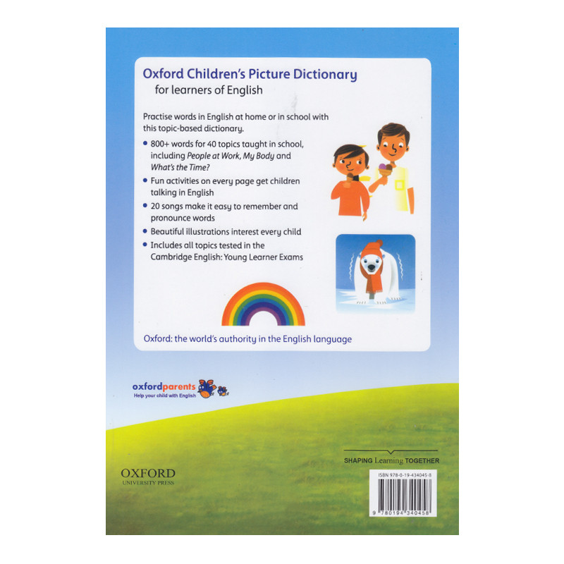 کتاب OXFORD Children's Picture Dictionary یک فرهنگ لغت تصویری مناسب برای کودکان است که 800 لغت را در 40 موضوع مختلف ارایه می دهد. از آنجا که آموزش لغات را در غالب تصویر آورده است آموزش را آسان تر کرده است تصاویر گویای معنای لغات است و نیازی به گفتن معنی فارسی نیست بنابراین میتوانید کلاس خود را بدون فارسی صحبت کردن بگردانید. از مزایای این کتاب موضوع محور بودن آن است و در مورد هر موضوع مکالمات مختلفی را ارائه کرده است. یکی دیگر از مزایای بسیار خوب این کتاب cd mp3 است که همراه این کتاب میباشد .اگر نگران هستید که آموزش صرف لغت جدید برای دانش آموزانتان کسل کننده است باید بدانید از مزایای دیگر این کتاب وجود 20 آهنگ متنوع است که با همان لغات جدید در غالب شعر و ترانه که باعث به هیجان امدن دانش آموزان و همچنین active شدن لغات و کلاس شما می شود.
